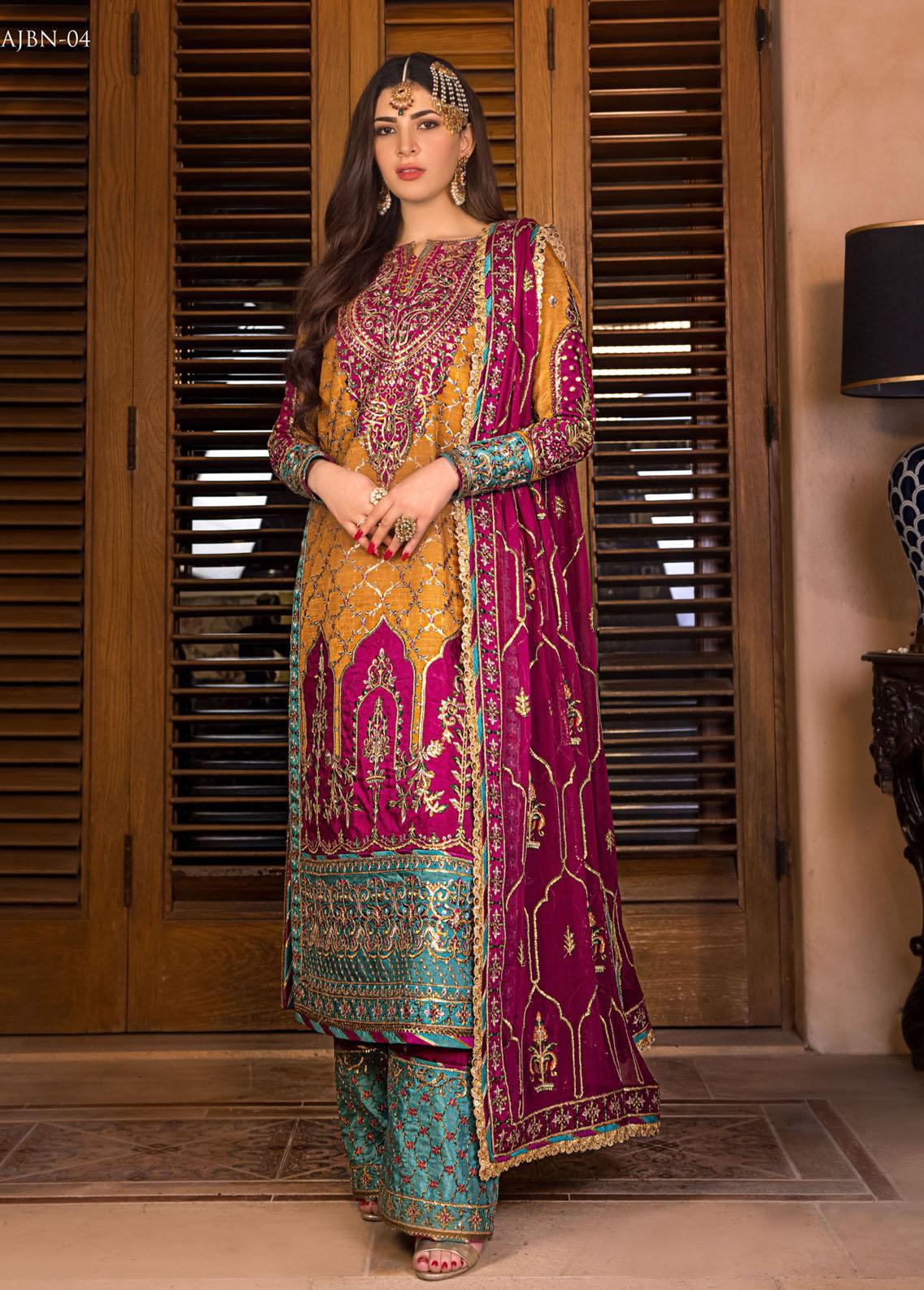 Lustrous, lush and lavish, this stunning long straight shirt featuring a stunning front and remarkable embroidery highlighted with shimmery heavy borders around the hemline. The golden hued mustard tone is complemented with gold zari and sequins with gold ornate borders comes in the bright combination of rani pink and ferozi. This outfit is cut from premium silk boasting a luxuriously fall and regal drape comes along with a contrast fuchsia dupatta highlighted with gold embroidered jaal all over with beautiful 4 side borders. A piece that you will cherish for years to come.
