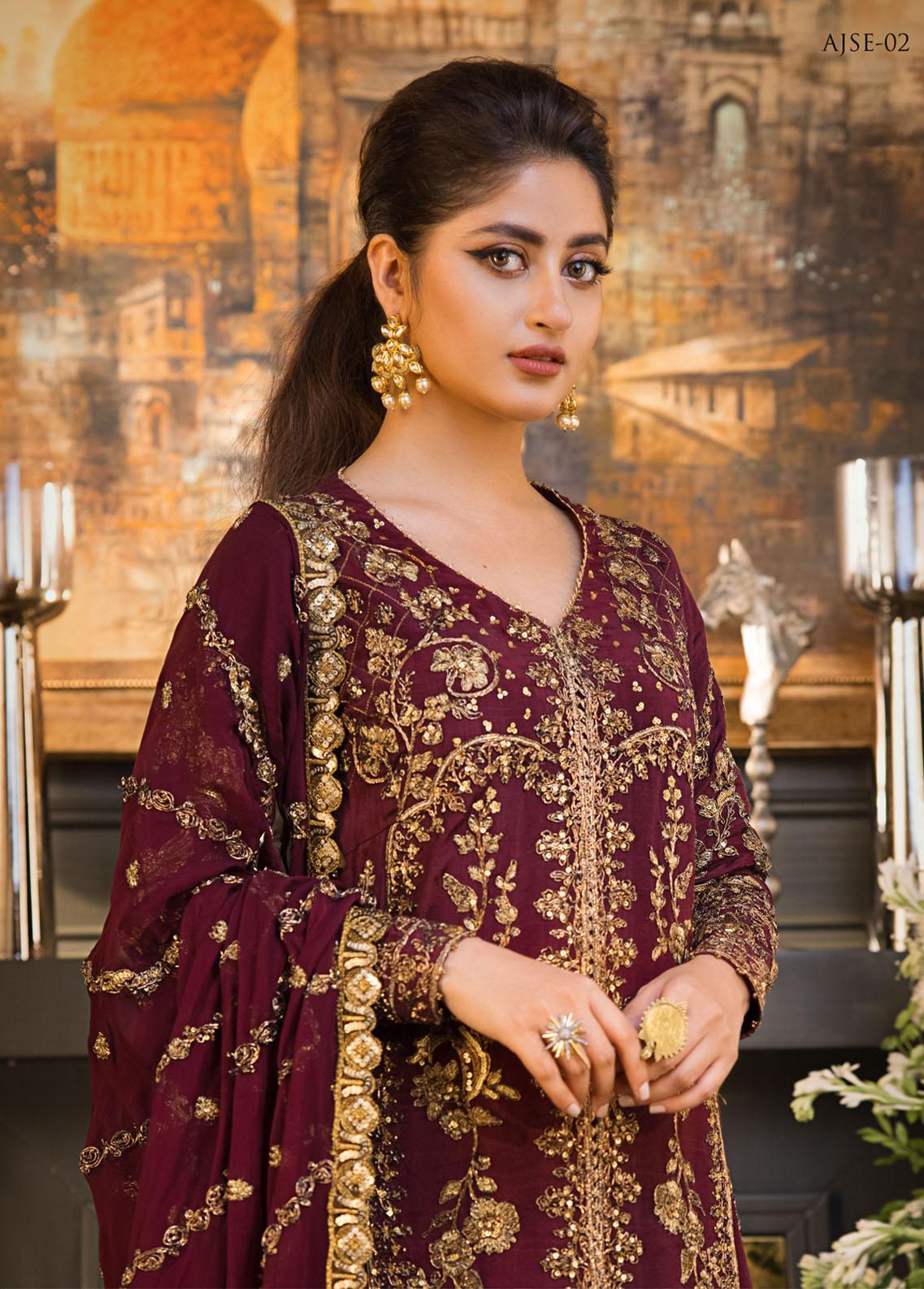 Sajal Aly is a vision to behold in this timeless front open ensemble in silk. The stunning design is curated to perfection as it features antique gold dori and cupped sequins work that is reminiscent of the age old craft of zardozi. The symmetrical pattern of arches and floral motifs give this design a classical look altogether. The elegant statement look is complete with matching dyed silk pants and a diagonal lined embroidered chiffon dupatta thus elevating the design to another level.