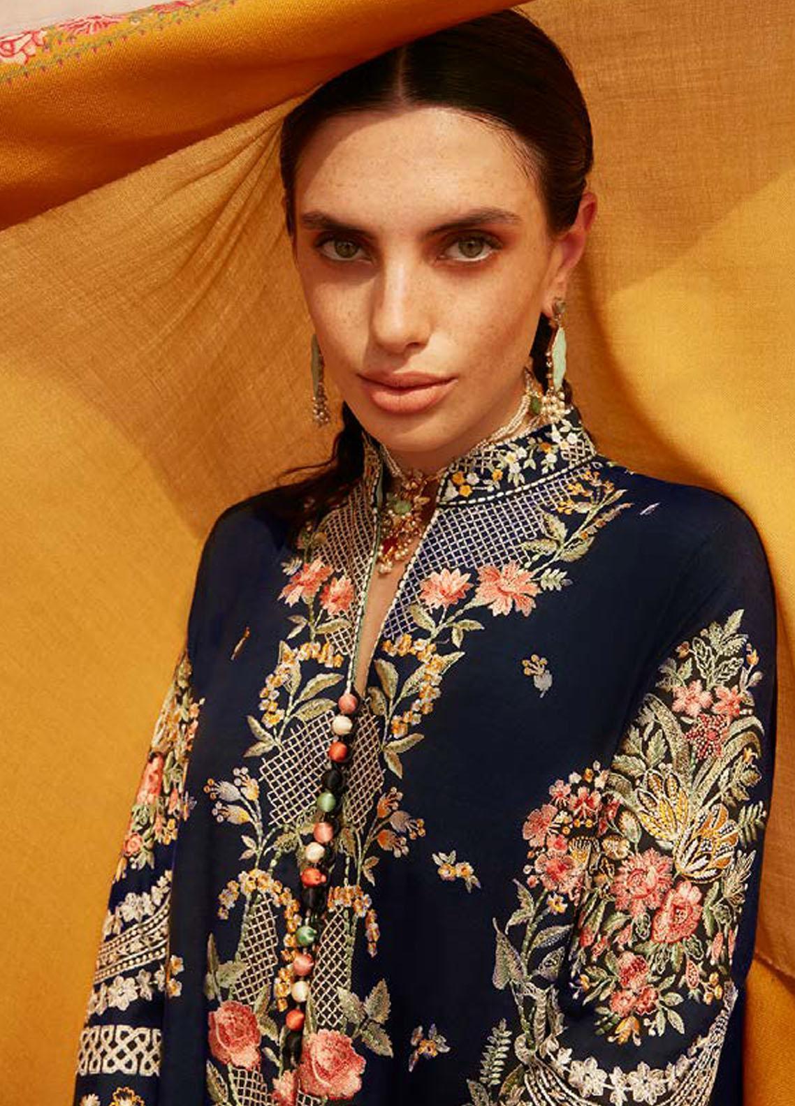 Delicate and textured taankas, in shades of barn red, olive and fawn create tribal aari embroideries that contrast gloriously with the deep navy canvas of Hera. Accompanied by a detailed embroidered neckline and a multi hued tukri border on the hem, this design creates a masterful boho Indigenous composition. The outfit comes paired with a sumptuous, artsy pure wool shawl to create the ultimate must have garment of the season.
