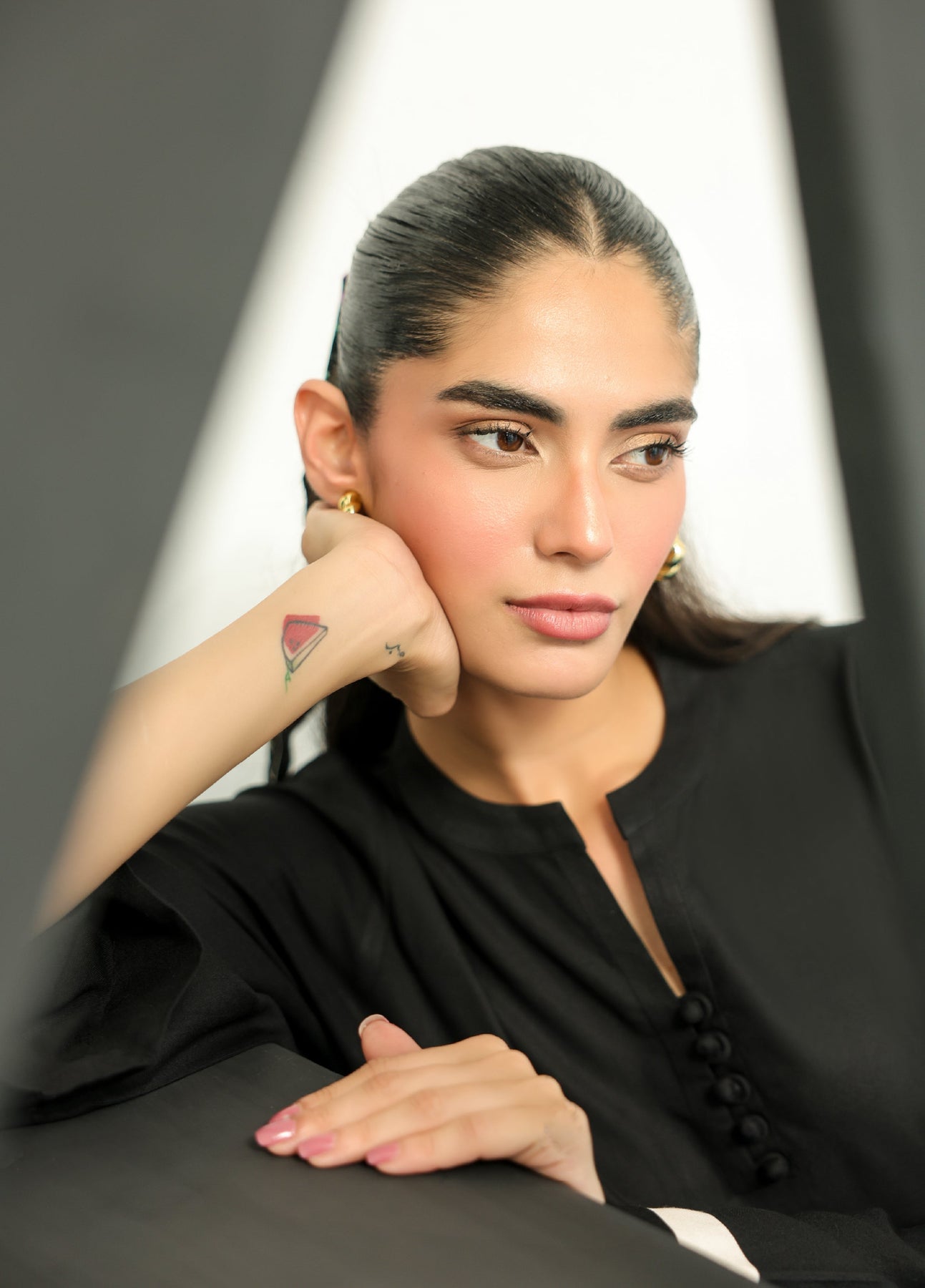 This outfit is a two piece co-ord set with the trousers being the statement piece, featuring a wide-leg or relaxed silhouette in a cream color. Trousers are adorned with intricate architectural line embroidery. This detailed work depicts a panoramic scene of buildings and structures, specifically inspired by the rich and historical architecture of Pakistan. The fine, detailed work grounds the modern outfit in a cultural aesthetic, creating a unique and sophisticated contrast with the plain black top with minimal details.