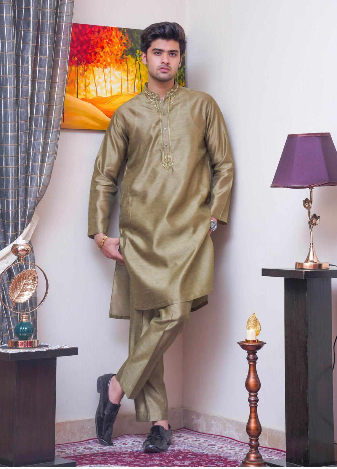 Formal Style Kurta Pants Suit for Men , Easy Iron , Dry Clean Only , Formal Raw Silk Fabric with Rich Hand Embriodrey , Special For Festive Use