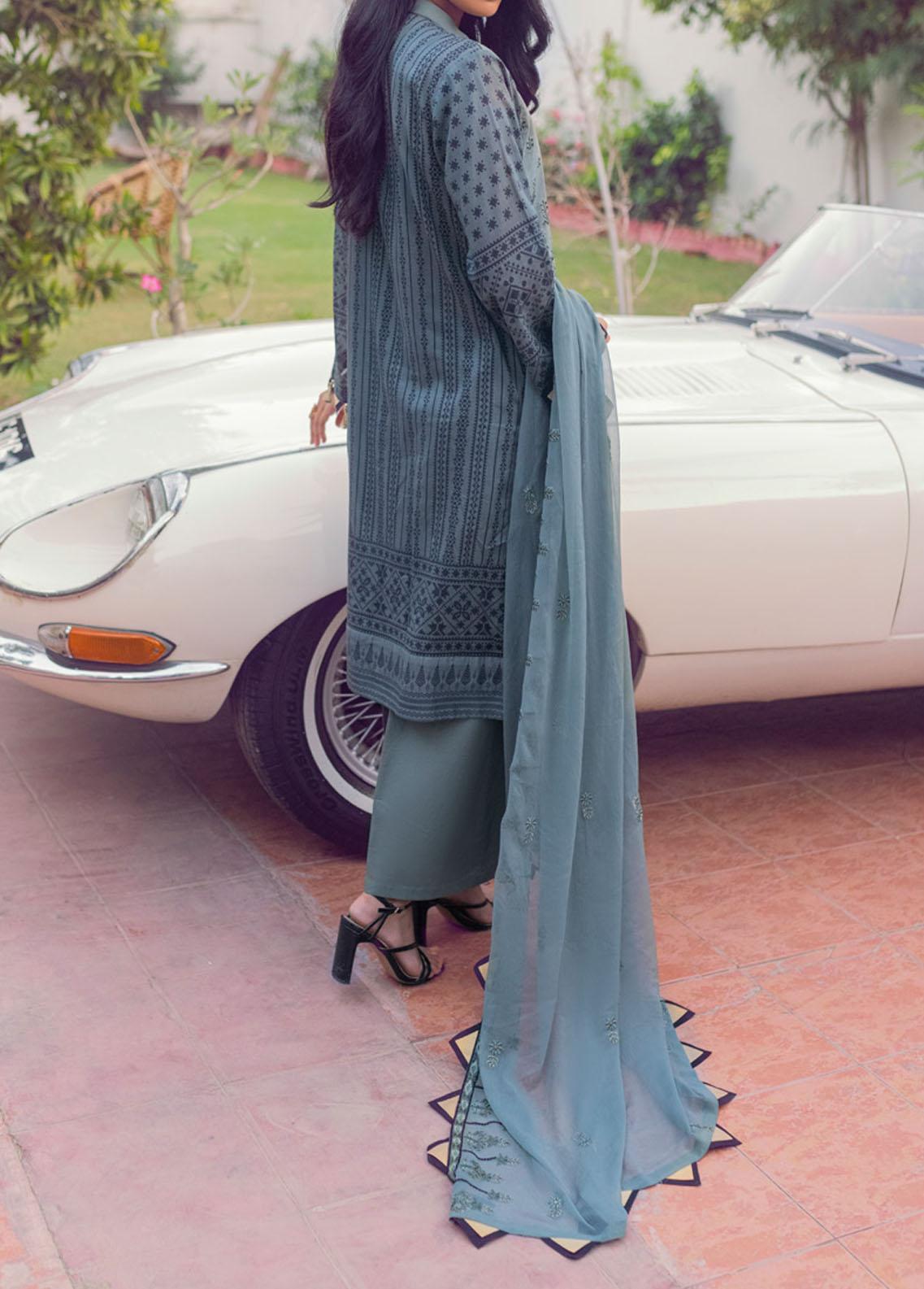 Shirt : Embroidered Lawn Front With Digital Printed Back And Sleeves Dupatta : Chiffon Embroidered Dupatta. Trouser : Dyed Cambric Trouser