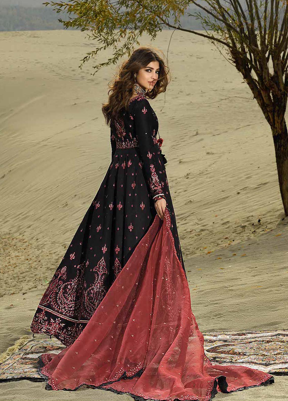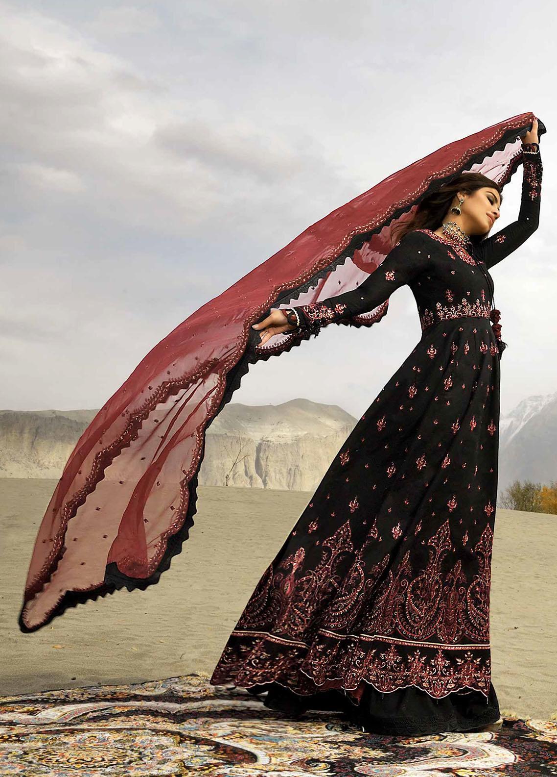 The Huge Expanse Of Dessert And Clear Blue Sky Complements This Noir Peshwas. The Threadwork And Zari Detail Is Impeccable . It Comes With An Embroidered Deep Red Organza Dupatta And Dyed Trouser.