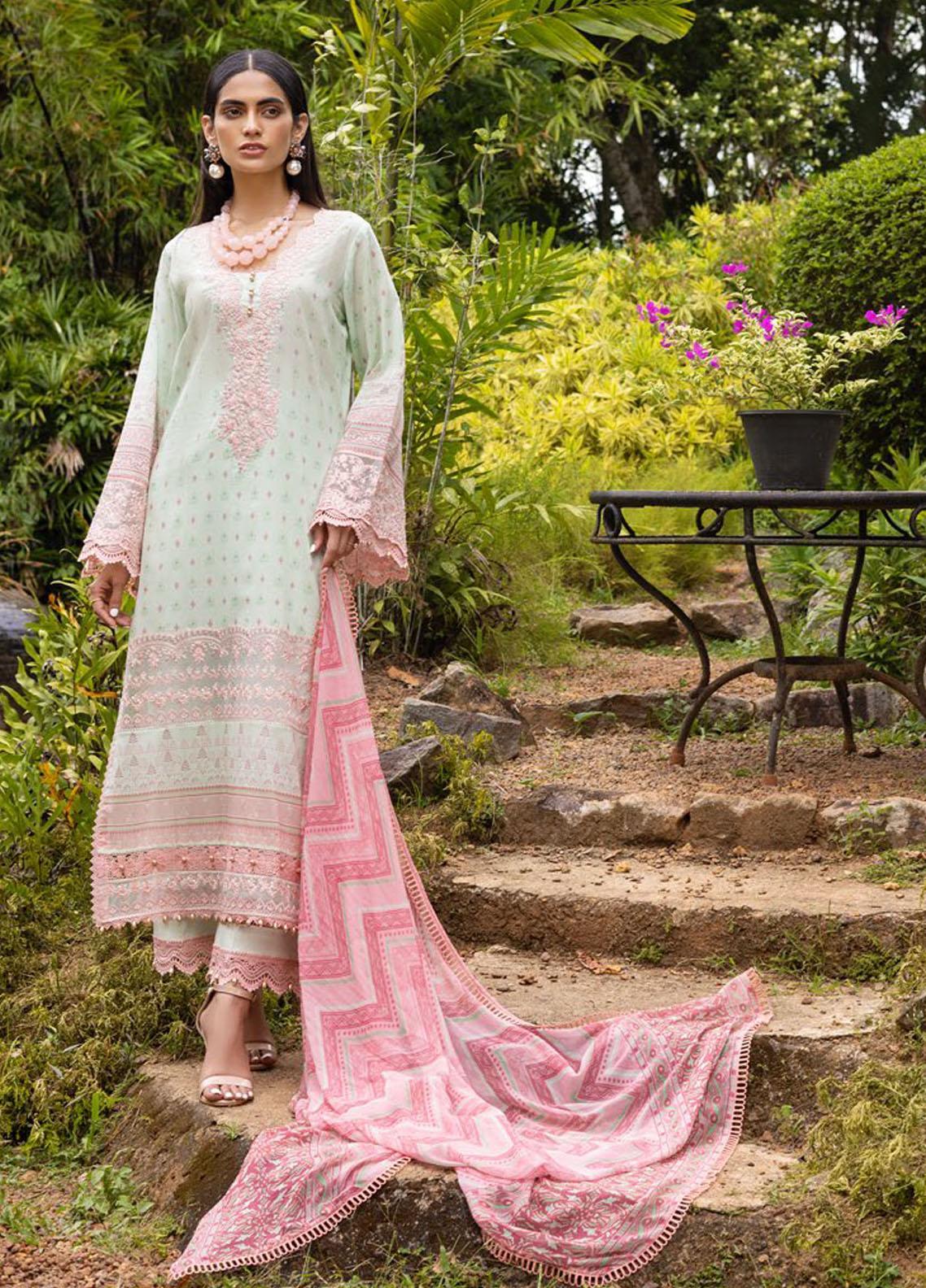 A captivating summer mint canvas of Paradise Dew with hints of powder pink hues is decorated with intricate embroideries along the neck area and hemline. The coordinating chiffon dupatta with waving chevrons and dupatta with lace trimmings instills a calm feeling.
