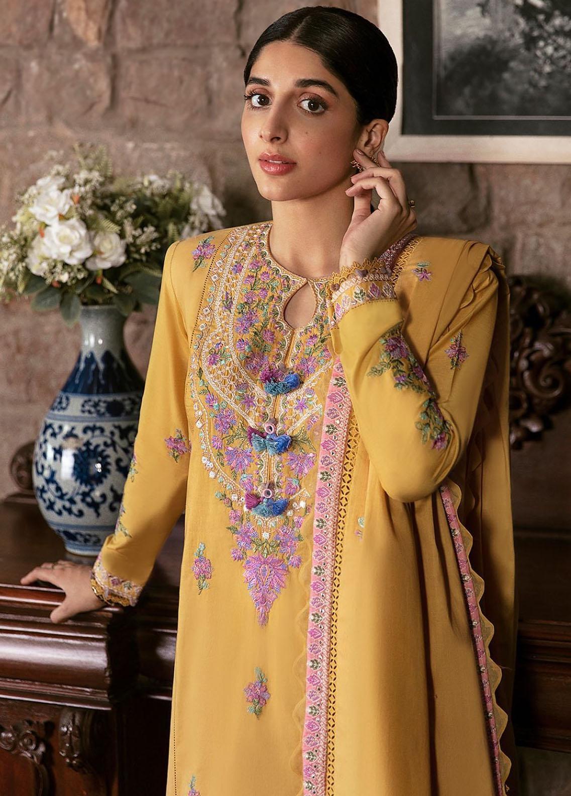 Shams - A beautiful shade of laguna yellow is layered with delicate Sindhi embroidery in shades of taffy, moss, cerulean and olive. Hints of delicately placed sheesha compliment the traditional tribal aesthetic and add glam and shimmer to the design. Ethnic motifs, airily worked with hand stitches are sewn on the light as air voile dupatta with a delicate four sided sequined border finishing off the canvas. The entire look, is thoughtfully designed to embody a fluid lightness suitable for the long intense summer ahead.Embroidered Front Center Panel (Lawn) 1 Piece Embroidered Front Left Side Panel (Lawn) 1 Piece Embroidered Front Right Side Panel (Lawn) 1 Piece Dyed Back (Lawn) 1 Piece Embroidered Sleeves (Lawn) 1 Pair Embroidered Hem Border (Lawn) 1 Meter Embroidered Dupatta (Voile) 2.5 Meters Embroidered Dupatta 4 Side Patti (Satin) 7.75 Meters Dyed Trouser (Cambric) 2.5 Meters