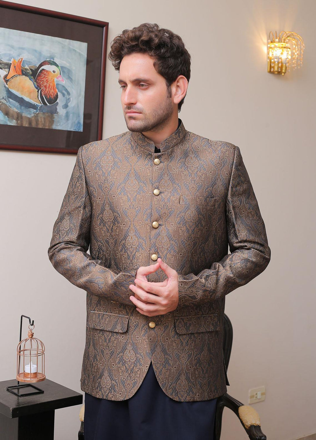 Real Image Cotton Silk Formal Prince Coat for Men - OPC - 012 Brown Gold