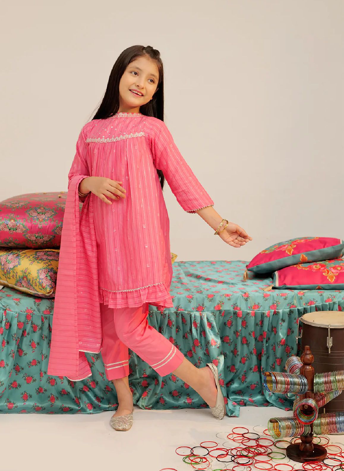 A line pleated body shirt with quarter straight sleeves Fancy embroidery on the shirt having frill on daman Finished with fancy lace all over Paired with straight fitted pants and a dupatta br data mce fragment 1