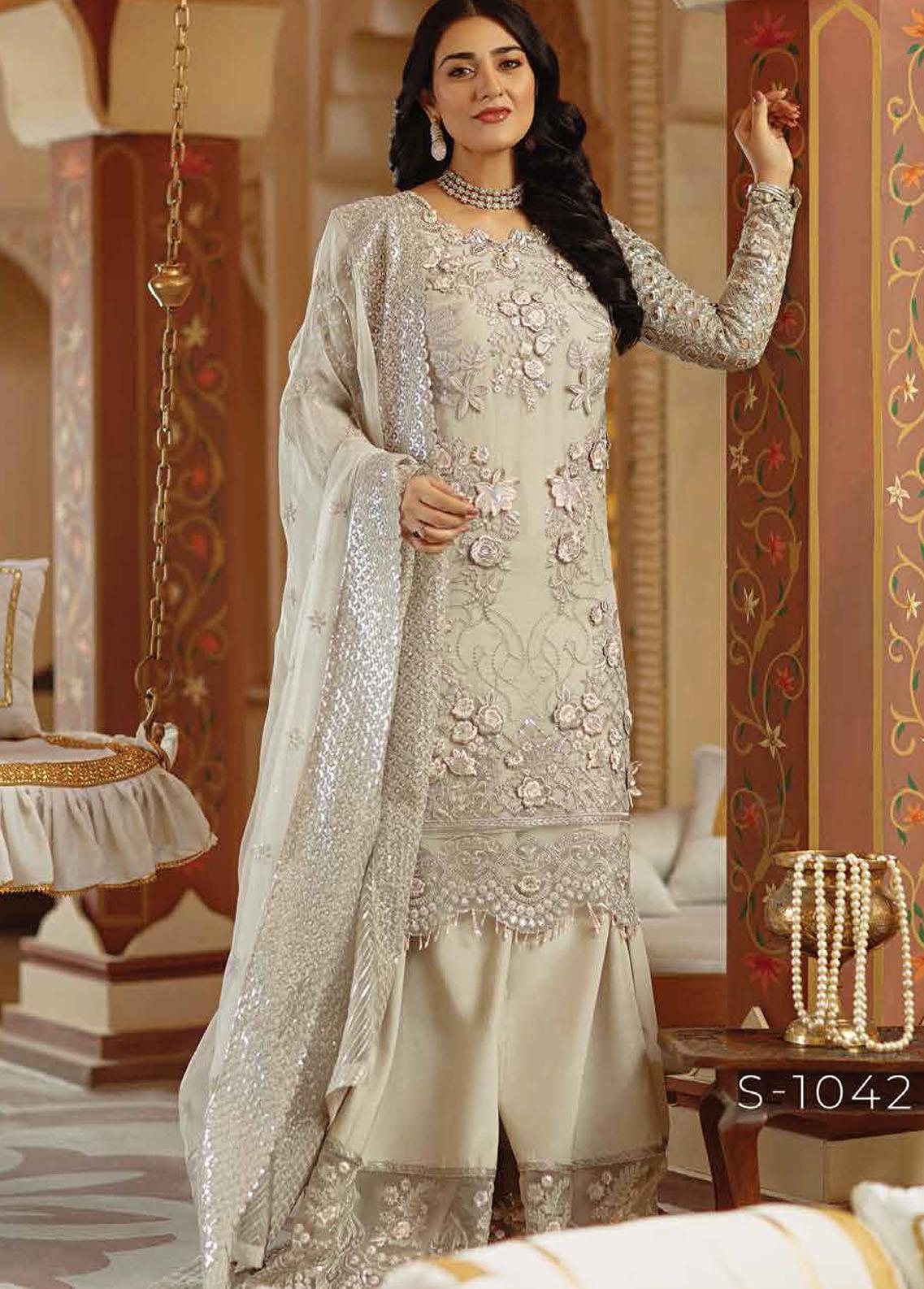 Serene Premium Embroidered Chiffon Suits Unstitched 3 Piece S-1042 Oyster Pearl - Luxury Collection