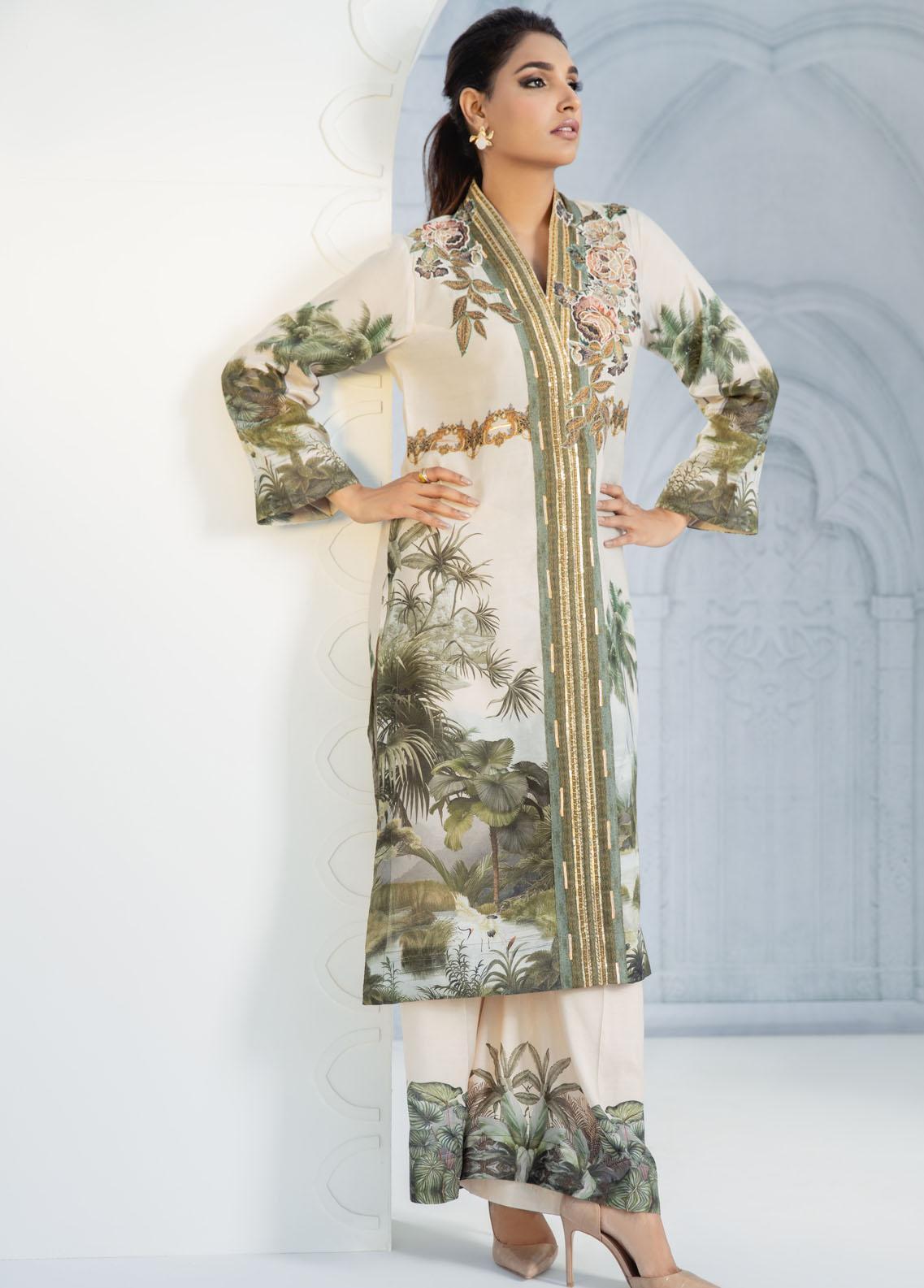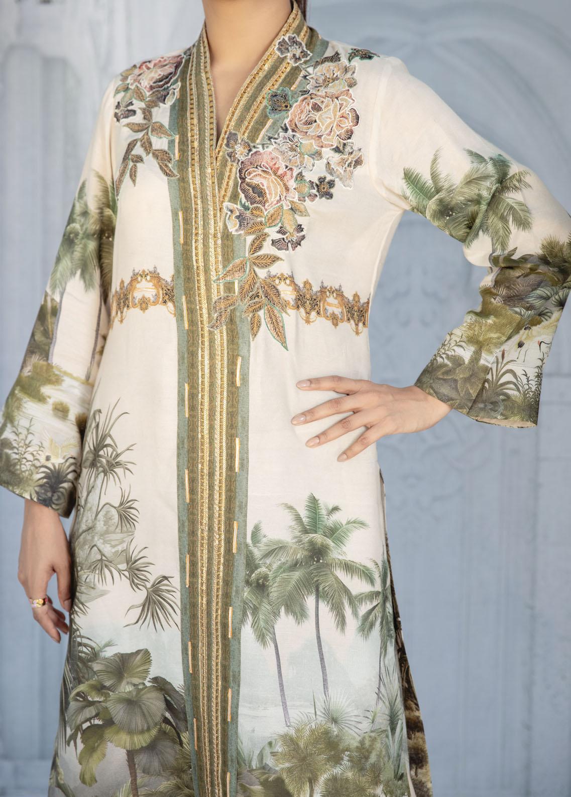 Effortlessly chic and comfortable straight shirt silhouette beautiful floral modern print on cotton silk fabric vintage floral velvet print appliqued on the galla enhanced with resham thread antique gold resham and sequin handmade lace on the galla. Can be paired with gorgeous printed pants as shown in the picture. Best for summer wear, collage wear, brunches and hi-teas.