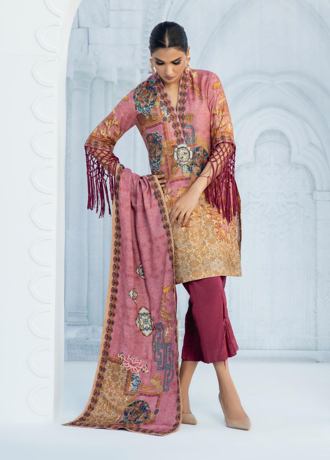 A gorgeous composition of beautiful shades of mauve and gold, creating a perfect style for the upcoming season. Handworked motif on neckline. Can be paired with stole and pants as shown in the picture. Best for summer wear, collage wear, brunches and hi-teas.