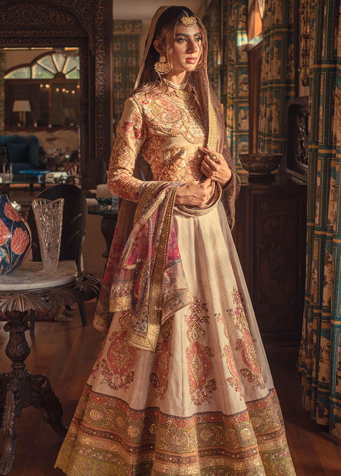 This exquisite dress features a floral Azalea lehnga choli set in a stunning combination of beige and coffee tones Crafted from luxurious silk fabric the choli is adorned with carefully handwork including tilla zardozi pearls and dabka complemented by a subtle touch of gota work The border is elegantly embroidered with delicate and intricate designs adding a touch of artistry to the ensemble Draped with digital printed dupatta in net with hand worked on it and style with embroidered border Shirt fabric SILK Dupatta Fabric NET Pant fabric SILK