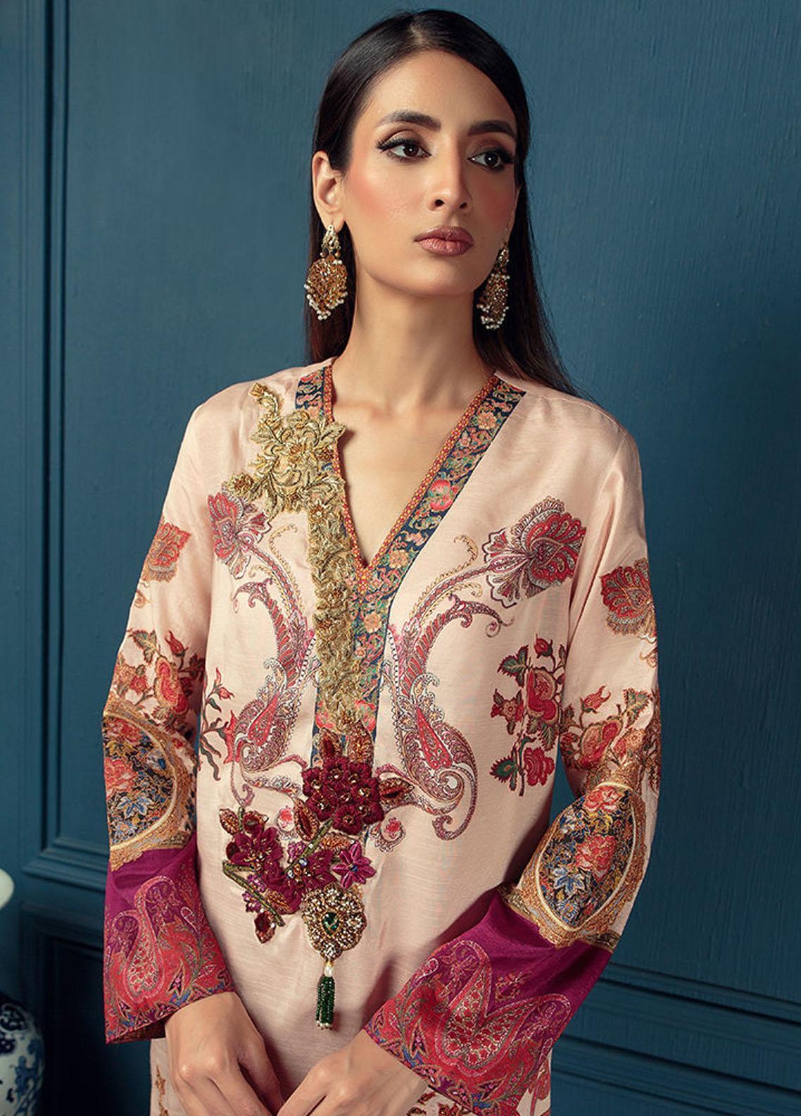 The captivating art work on the silk in cool toned canvas styled in straight long shirt style. Zari detail work in front with handwork embellishments are traditionally crafted. This is a classically chic look, both wearable and versatile. Gives you a complete look when paired with matching printed pants.