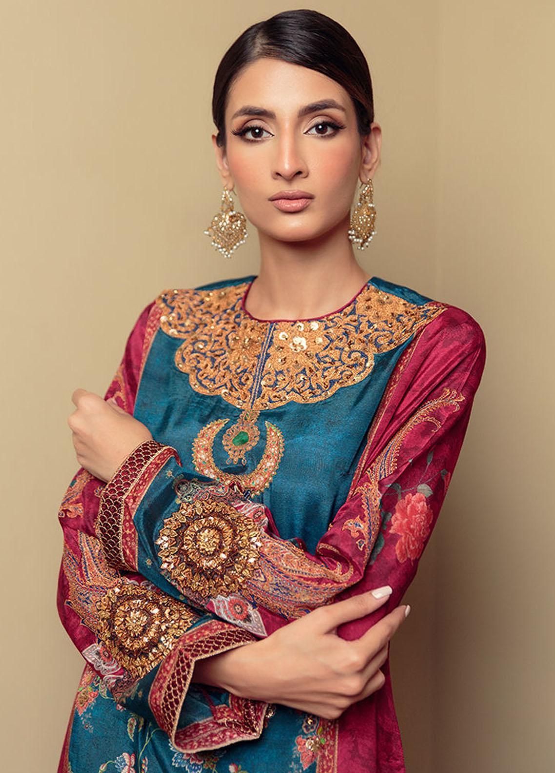 Long straight shirt traditional print on silk fabric this print is inspired by the Mughal era art textile depicting different shades of maroons, reds and blues beautiful antique golden tila thread outline to enhance the detailed print handcrafted galla created with tila thread and zardozi work finished with delicate handmade antique tila and resham thread lace. Gives you a complete look when paired with same solid pants.