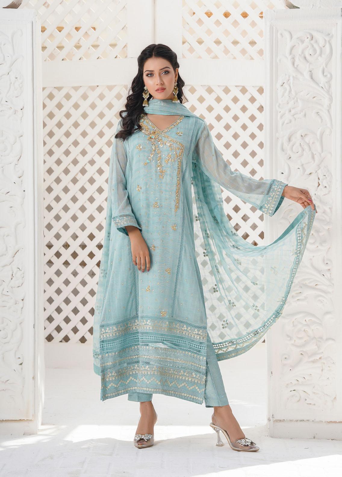 Details A rhapsody of Feroza Color intricate with geometric embroidery design with 7mm Sequins and thread work design along with Hand craft of Kora , Dabka and White Pearls to make ensemble more classic with embellished dupatta embroidery all over