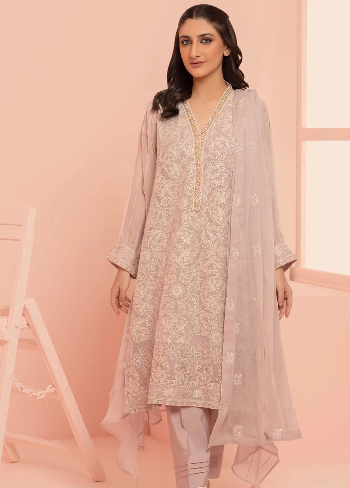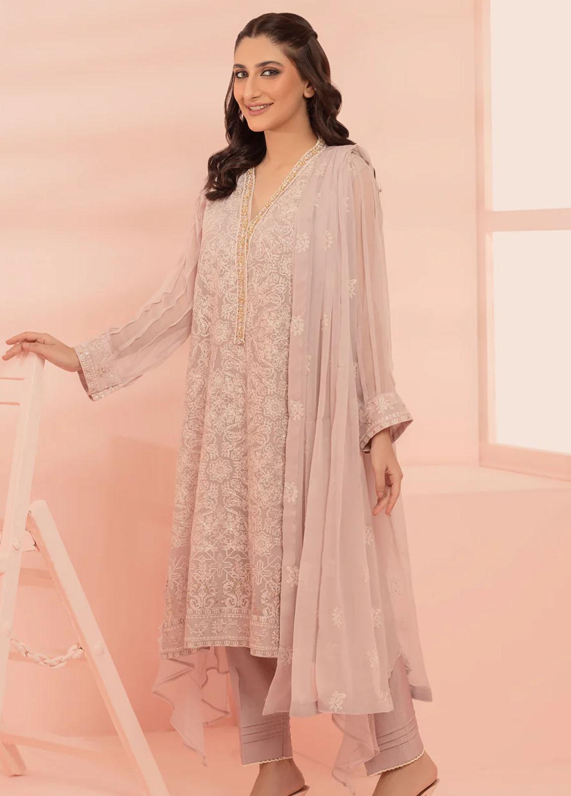 Ready to wear chiffon tunic in lilac shade ornamented with hand embellishment with sequins, lace and thread work is used on the embroidery for an ethereal look
