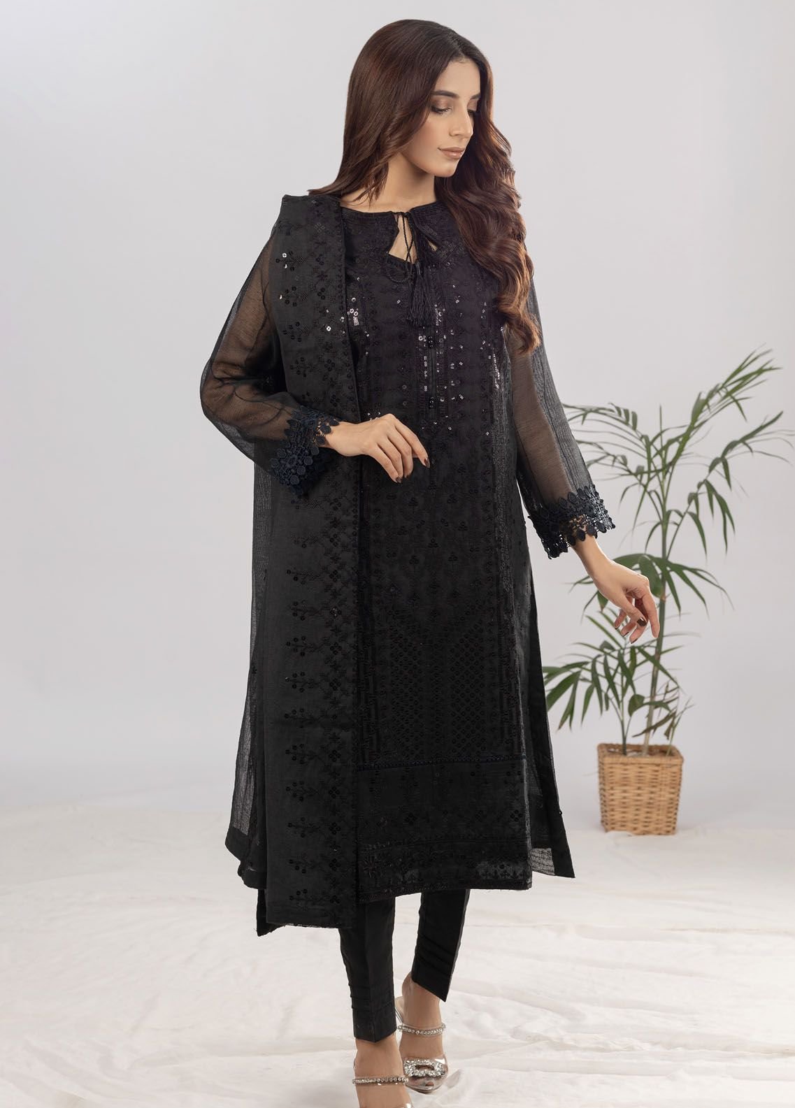Fabric : Khaddi Net , Color : Black , Decription : Embroidered Shirt with Embroidered Duppata and Raw Silk Trouser