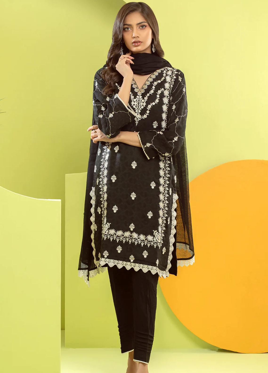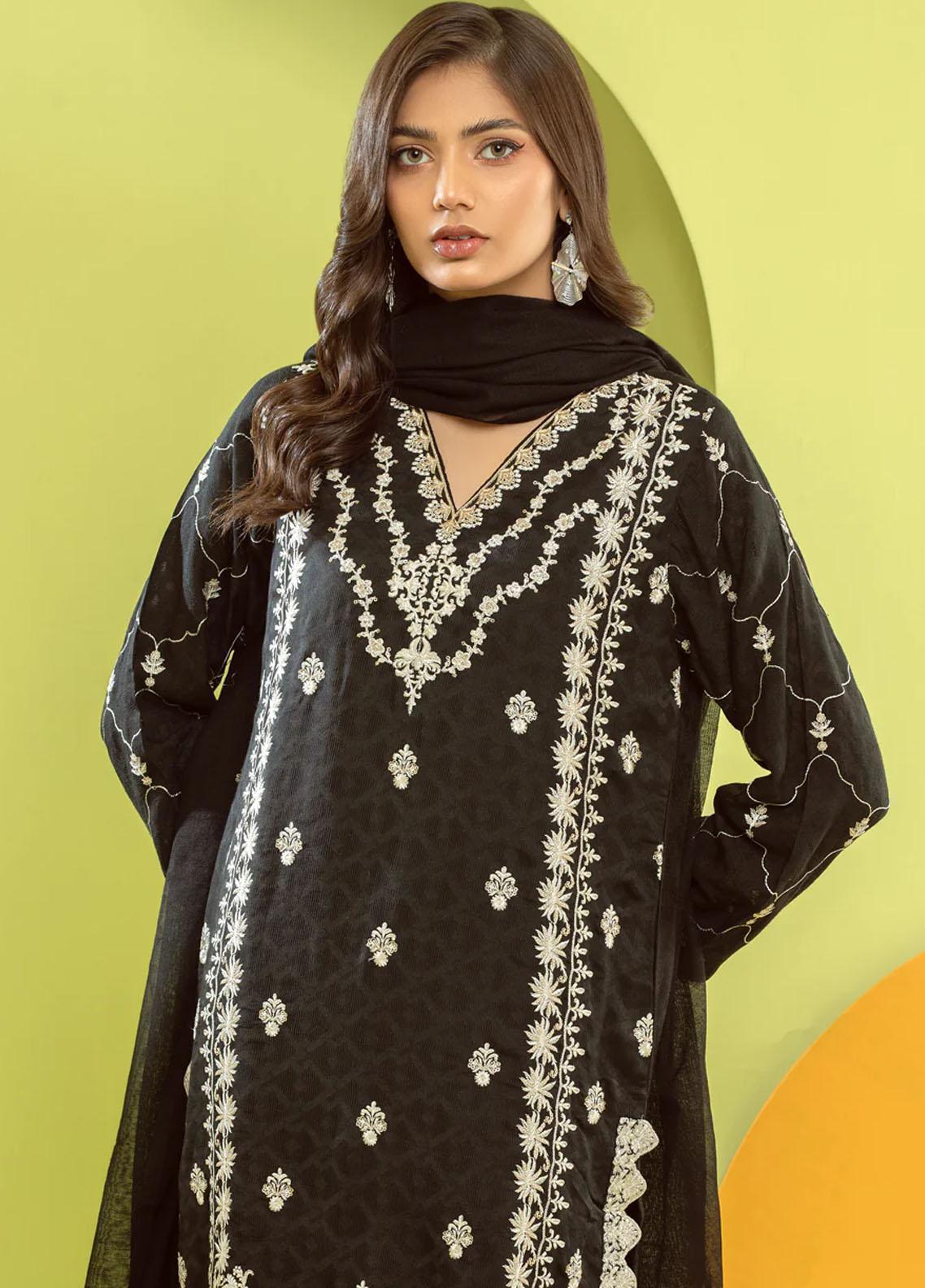 3 piece StitchedEmbroidered Cotton Jacquard Shirt Cotton Trousers Embroidered net dupatta.