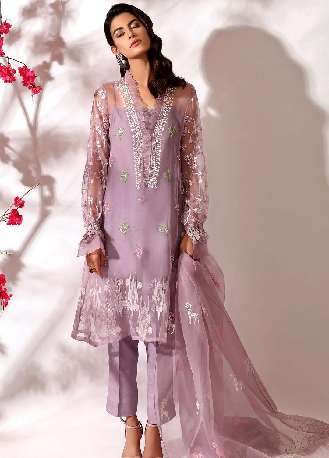 Odel: a pastel pink 3 piece embroidered luxury ready to wear organza suit paired with a straight trouser and light net dupatta.