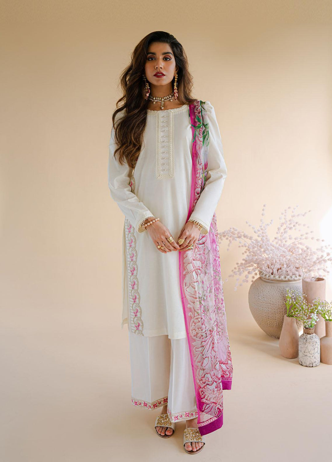 Ainar: another luxury pret embroidered 3 piece suit coming in a peachy pastel color palette paired with a matching embroidered dupatta and sleeves with straight flapper style plain trousers.