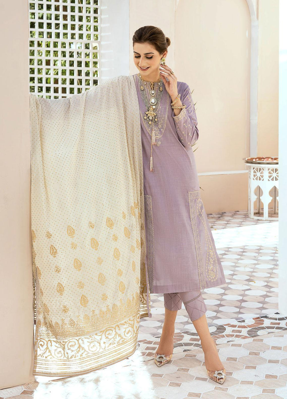 Ermina pret being the latest collection of 2021 by shurooq is worth your while. The collection features 10 intricately embroidered designs that are unique and elegant. Each of the designs contains a beautiful amalgamation of embroideries, embellishments, and detailed work of crystals and pearls. The colors are quite distinctive and unique, especially the way designers have paired and played them with the dupattas, trousers and shirts.