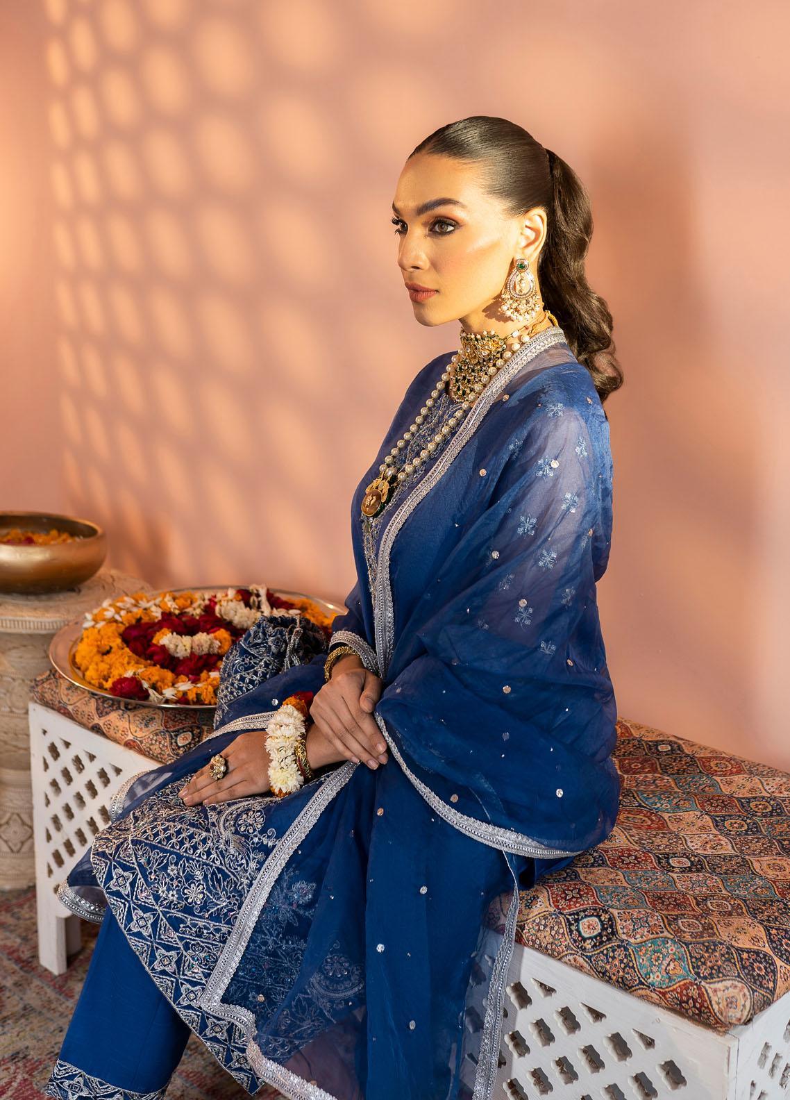 This blue embroidered organza canvas features a worked neckline adorned by embellishments. The embroidered sleeve makes it regal. Paired with raw silk pants and an ethereal mukesh dupatta.