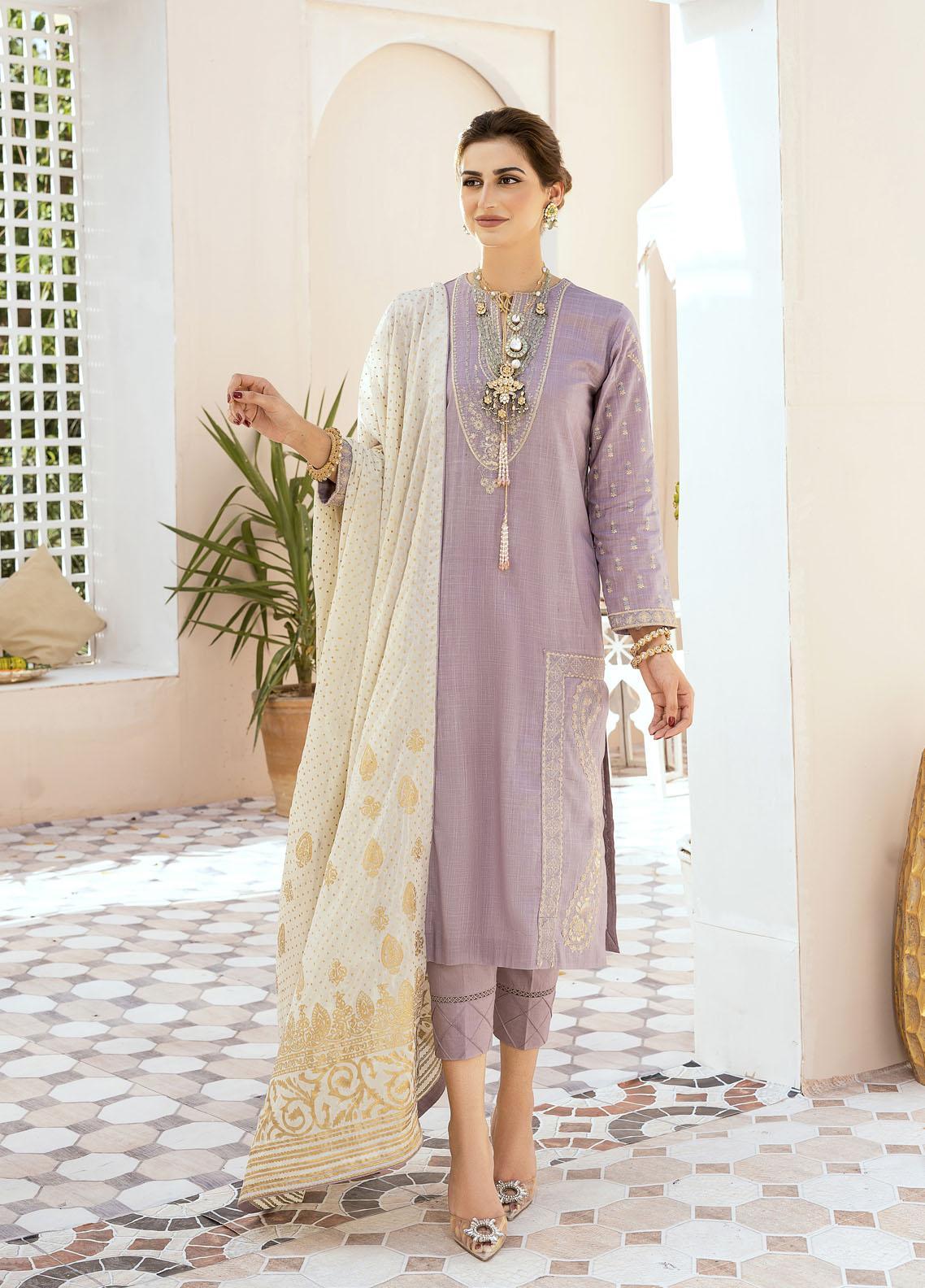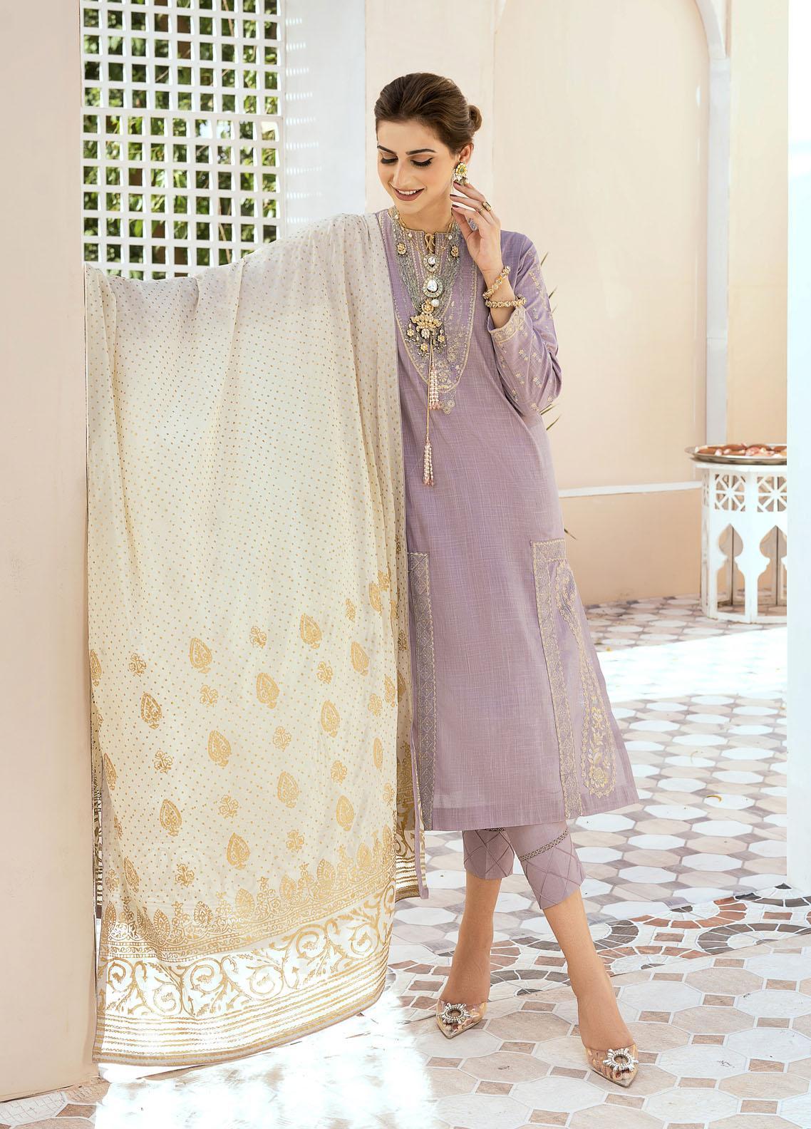 Kundan Is A Gorgeous Lilac Canvas Featuring An Embroidered Front, Back And Sleeves. The Intricately Designed Neckline Tassels Enhance It Further And Make It Perfect. Combined With Tonal Trousers With Stitching Details And Gold Pasting Block Printed Silk Dupatta.