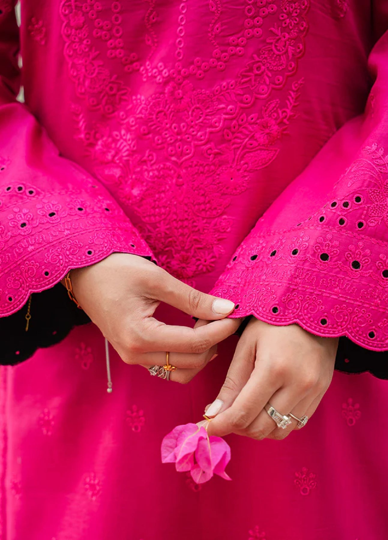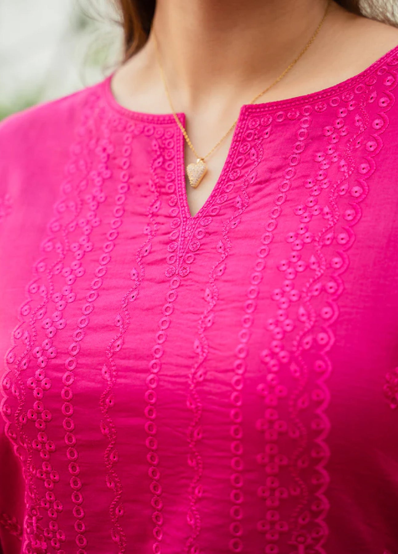 Floria is a statement two-piece set in a striking fuchsia pink base, crafted from premium lawn. The shirt is fully embroidered, showcasing intricate detailing that exudes timeless elegance. Chikankari embroidered lawn borders on the shirt and sleeves lend an artisanal touch, enhancing the richness of the design. Paired with a complementing cotton trouser, Floria is the perfect blend of vibrant charm and refined sophistication.