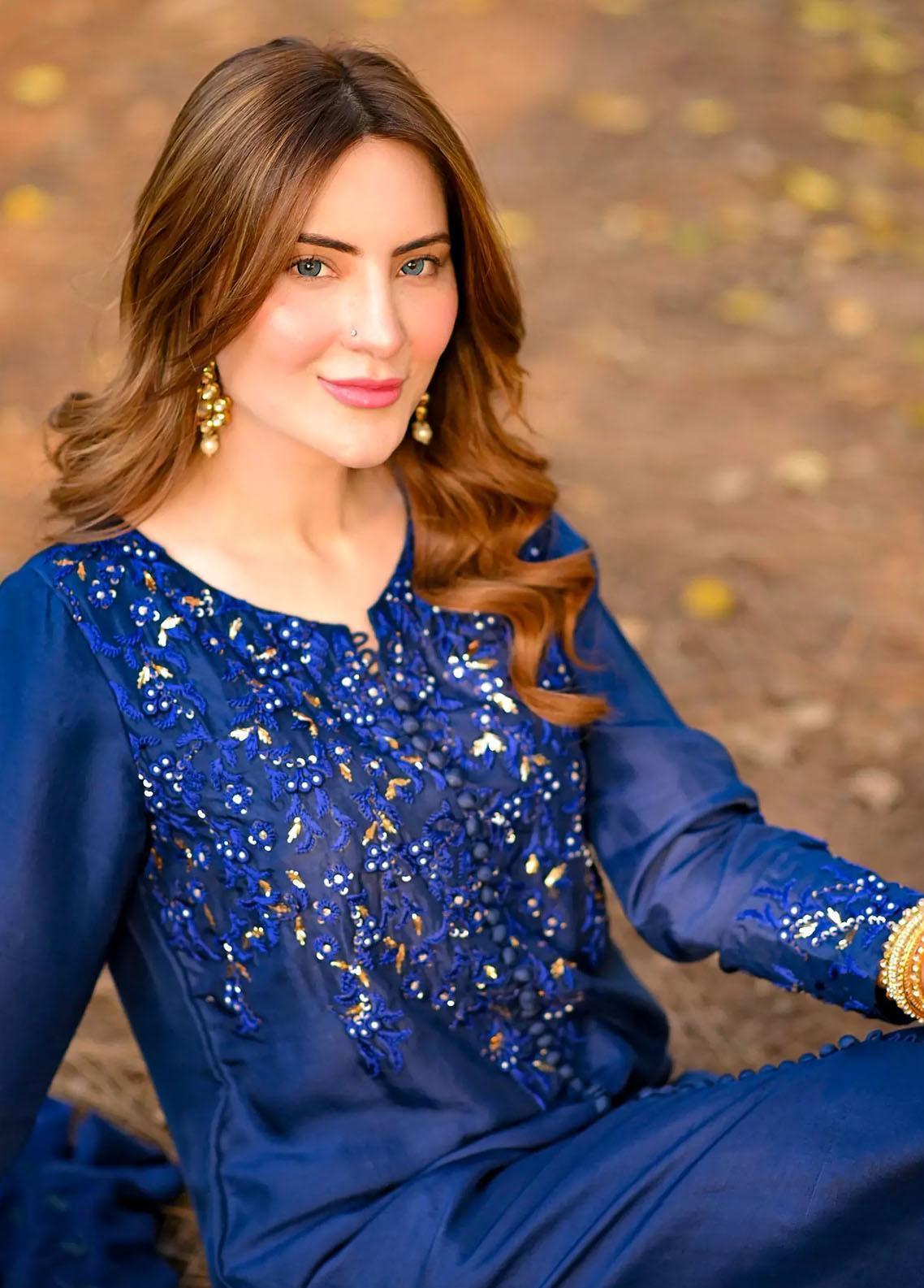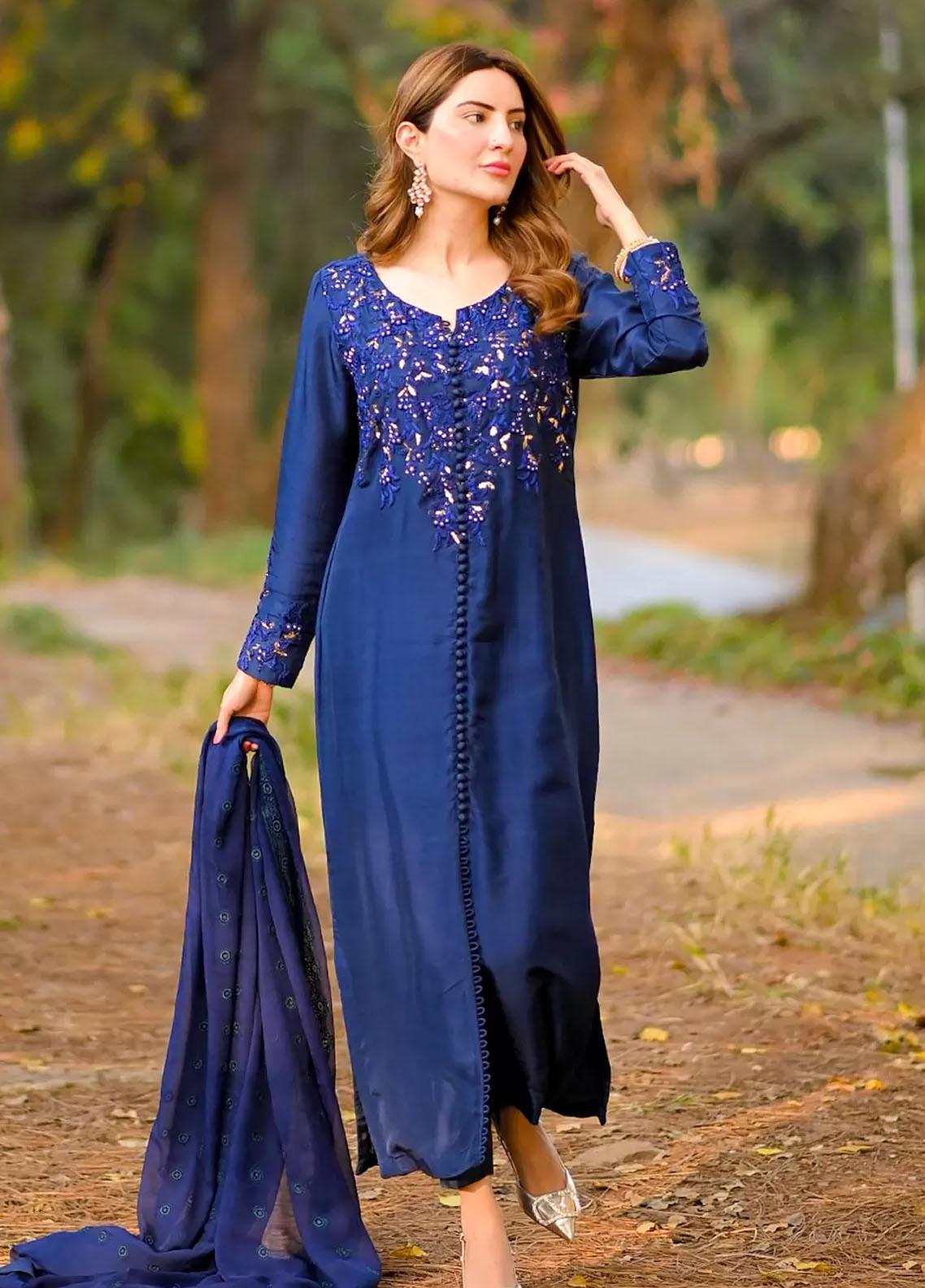 This Vibrant Blue Hue On A Sleek Long Cut Has Beautiful Resham Mukaish And Sequence Work On The Upper Bodice And Sleeves With All Front Loop Button Detail We Have Paired This Shirt With Straight Pants And Embroidered Chiffon Dupatta
