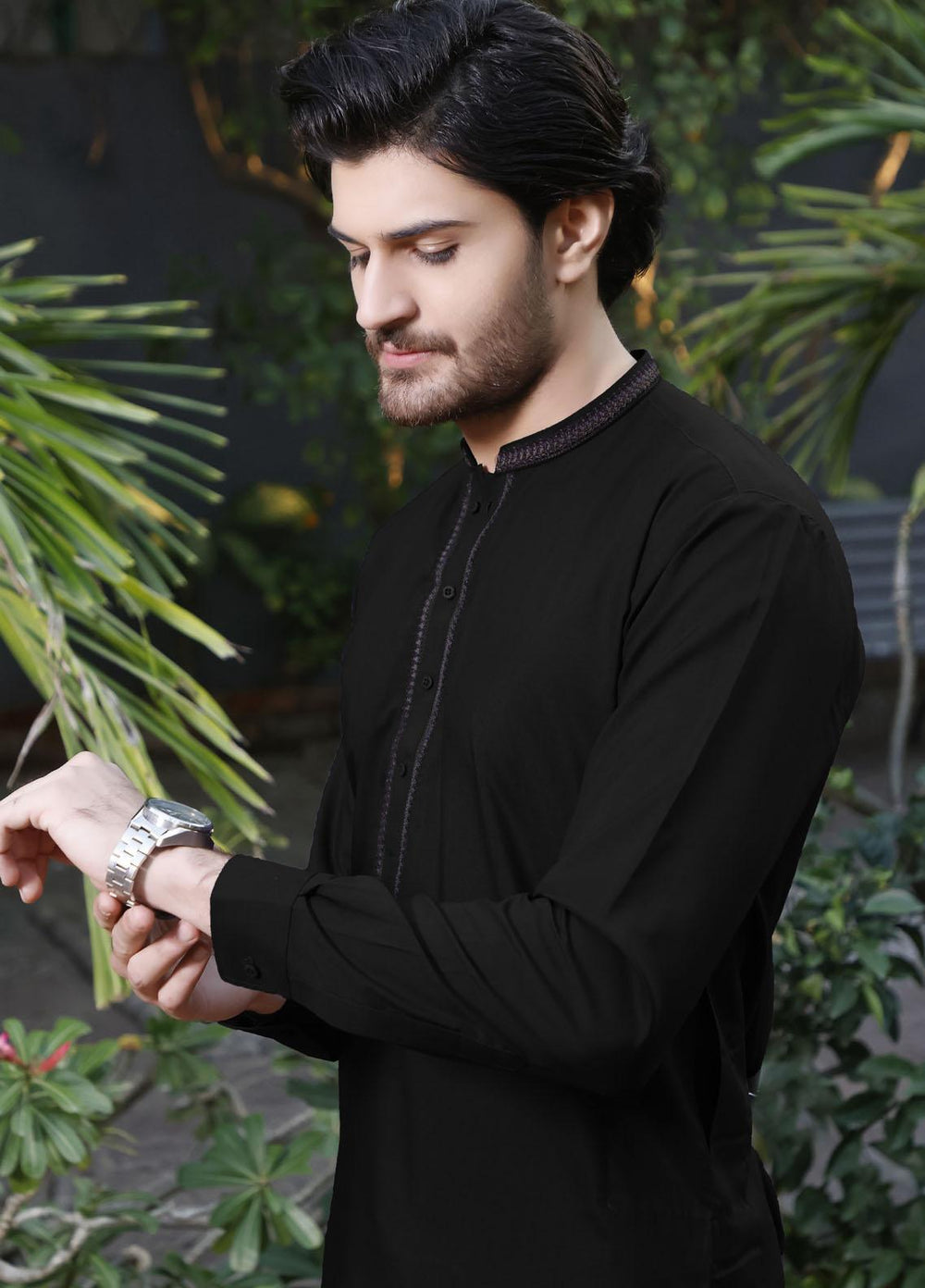 TGM Wash N Wear Shalwar KameezType: Shalwar Kameez Details: Men's Formal Kameez Shalwar with Embroidery on Collar and PlanketΓβ Fabric: Premium Blended Material Colour : Black _x005F