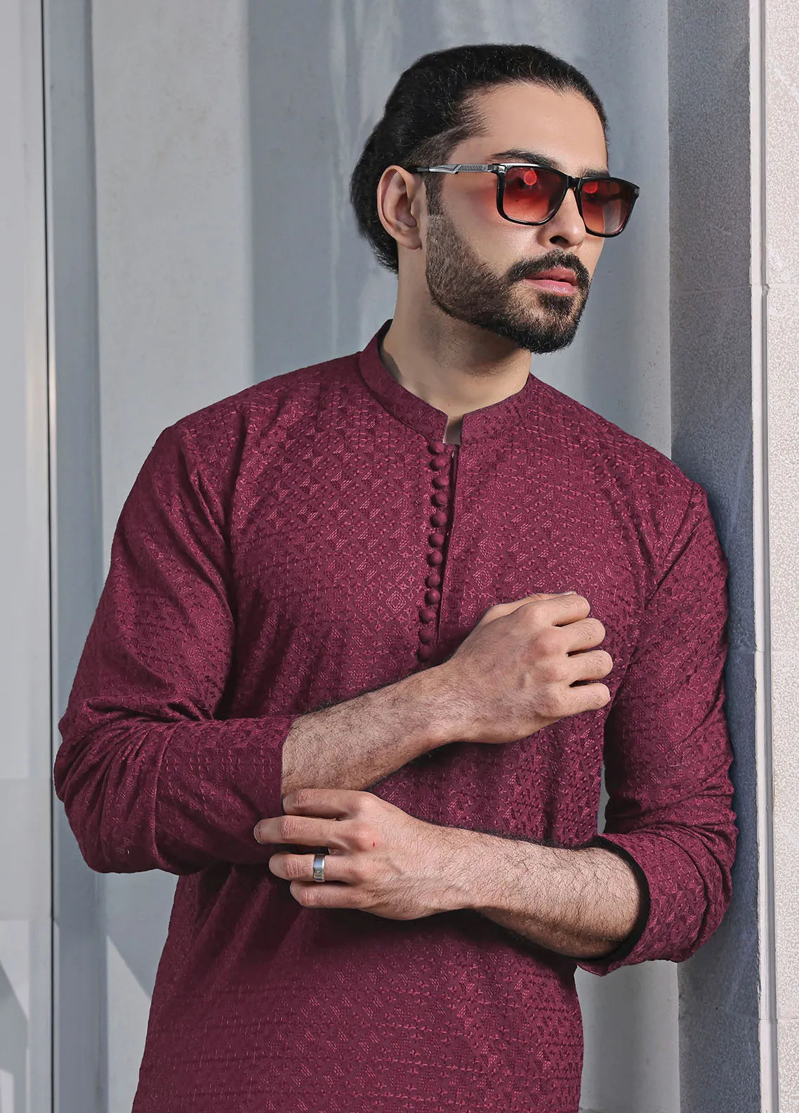 Mens Formal Chikan Fabric Kurta with Off White Pyjama