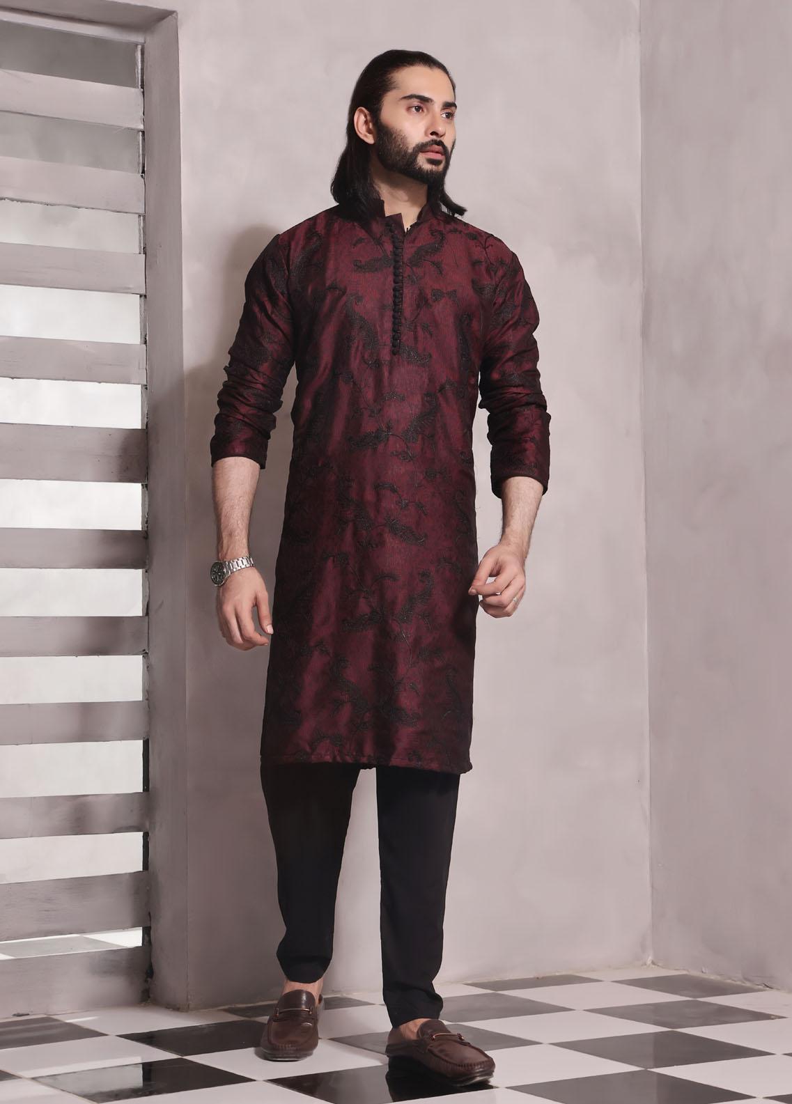 The Great Master (TGM) Jamawar Fancy Kameez Shalwar for Men -  Garnet Silk