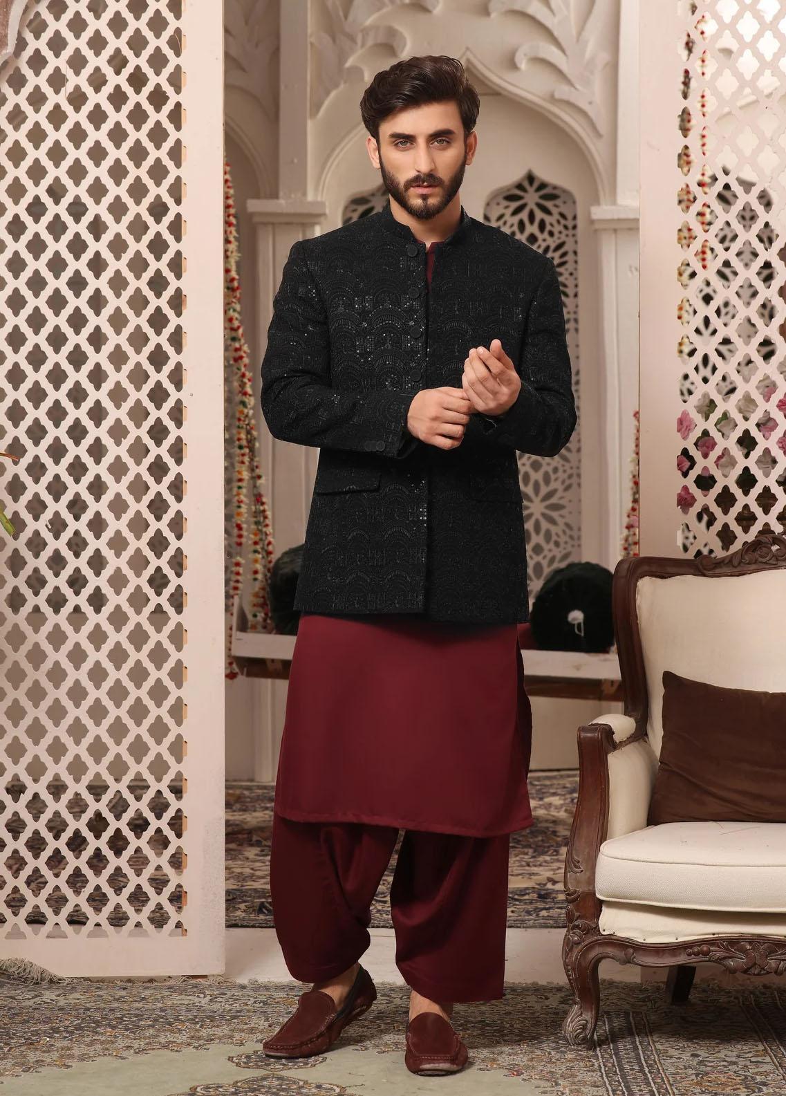 Mens Designer Prince Coat On Raw Silk Fabric with Chikan Embroidery