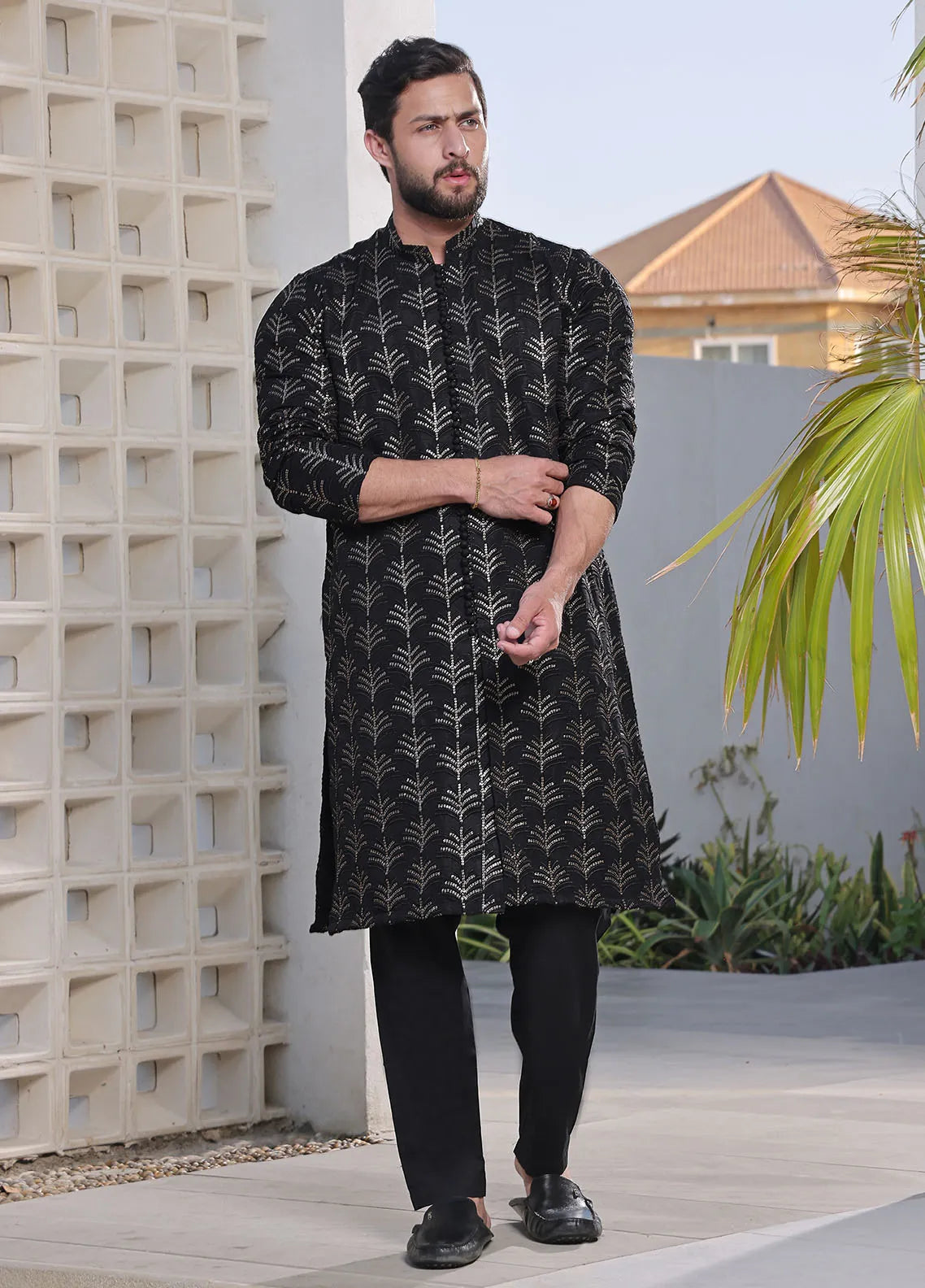 Mens Formal Front Open Sequence Kurta with Matching Pyjama