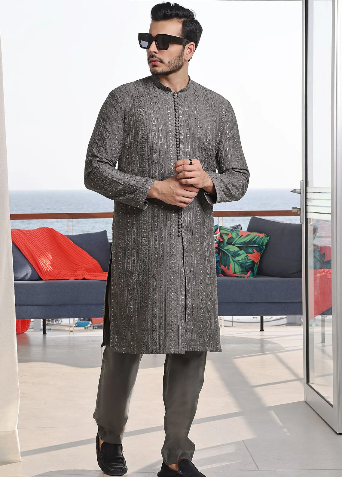 Mens Formal Embroidered Front Open Raw Silk Kurta Pyjama