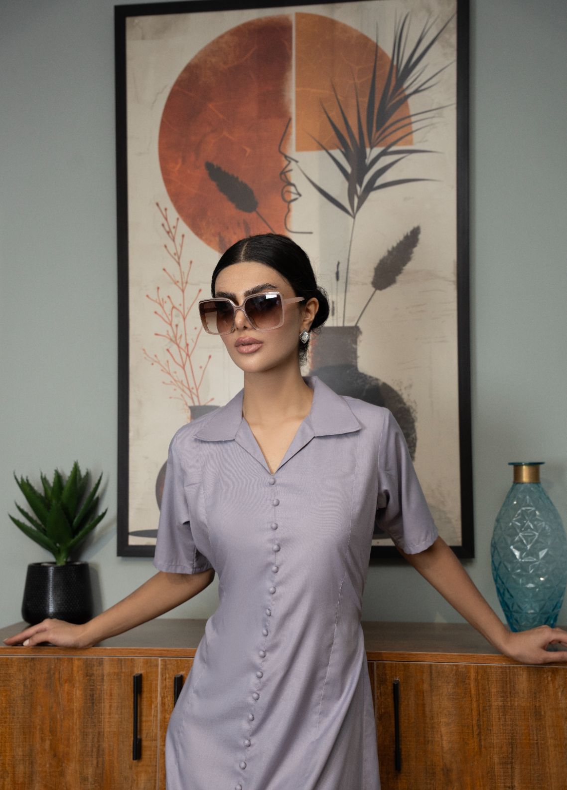 A long, dusky-toned dress with a coat-collar neckline and front-button design — timeless, versatile, and workwear-ready.