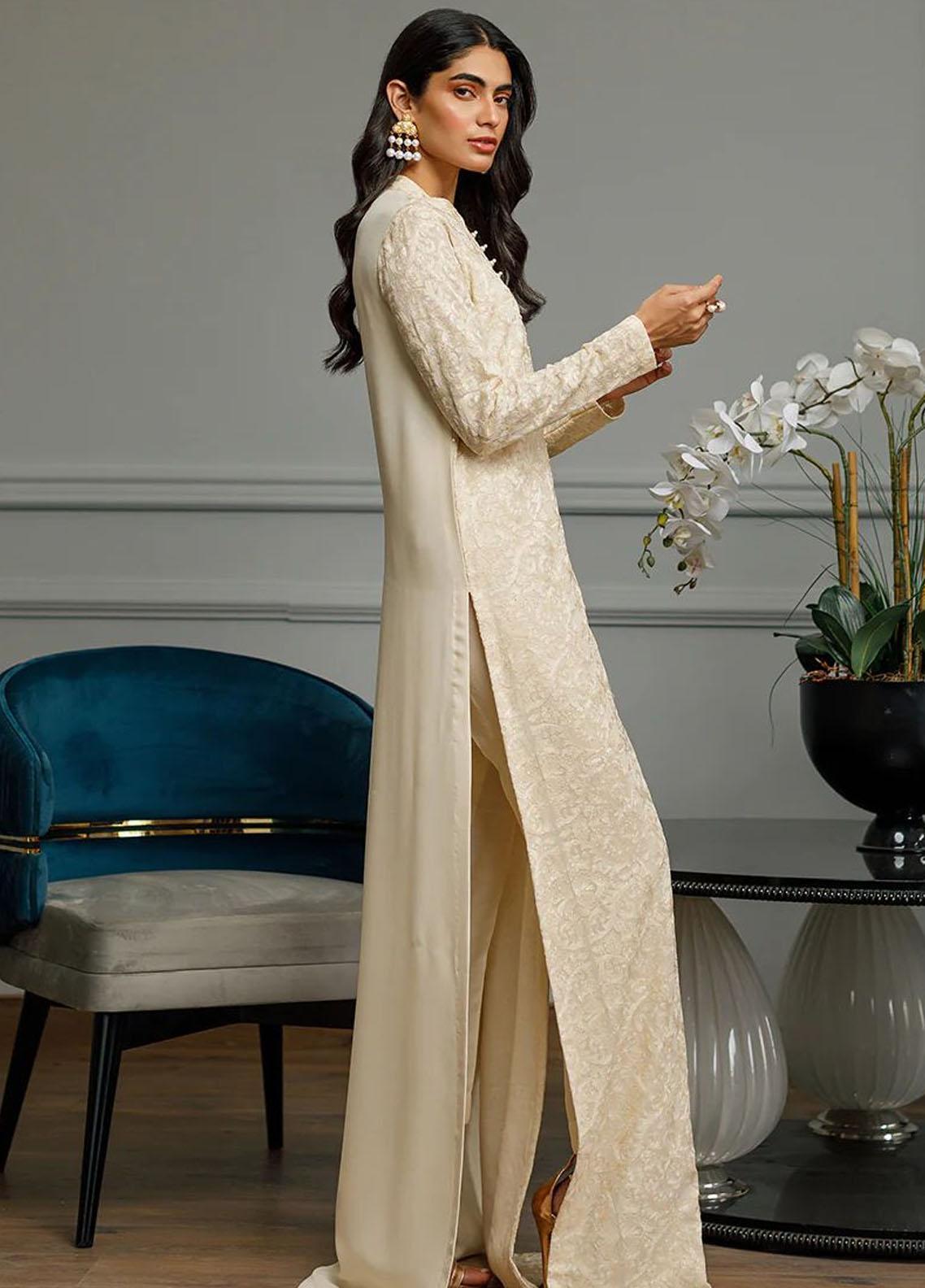 Experience true grace with our captivating off white front open gown intricately crafted from chiffon and masterfully embroidered with a nature inspired design It s all in the details a hint of shimmer comes from the sequins that ornament the botanical embroidery A collar neck design sets this striking piece apart topped off with looped buttons for an extra flair Despite the intricate front detail the gown s back remains elegantly plain to balance the design a striking representation of a refined and stylish aesthetic Claim your Chiffon Embroidered Gown today and embrace elegance