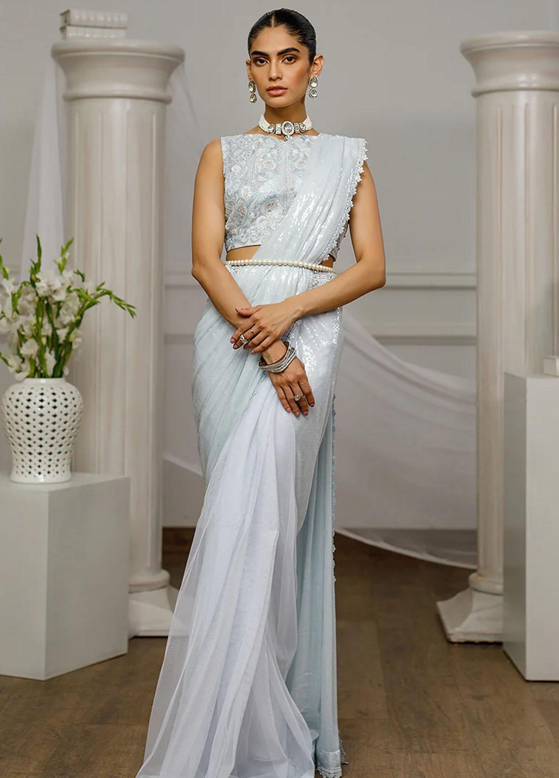 Enhance your style with this elegant net embroidered blouse in a stunning light blue shade With delicate patterns of thread silver zaree and sequins work this blouse features a sweetheart front neckline and a stylish keyhole back string design Pair it with the mesmerizing net saree which also boasts sequins along its loose end adorned with a charming lace border The blouse has a convenient side zip closure while the saree has a petticoat inside For your convenience the unstitched saree details are as follows 1 embroidered blouse 3 5 yards of sequins fabric 3 5 yards of net fabric 11 yards of embroidered border 4 yards of chamois fabric Indulge in this exquisite ensemble and achieve a captivating look effortlessly