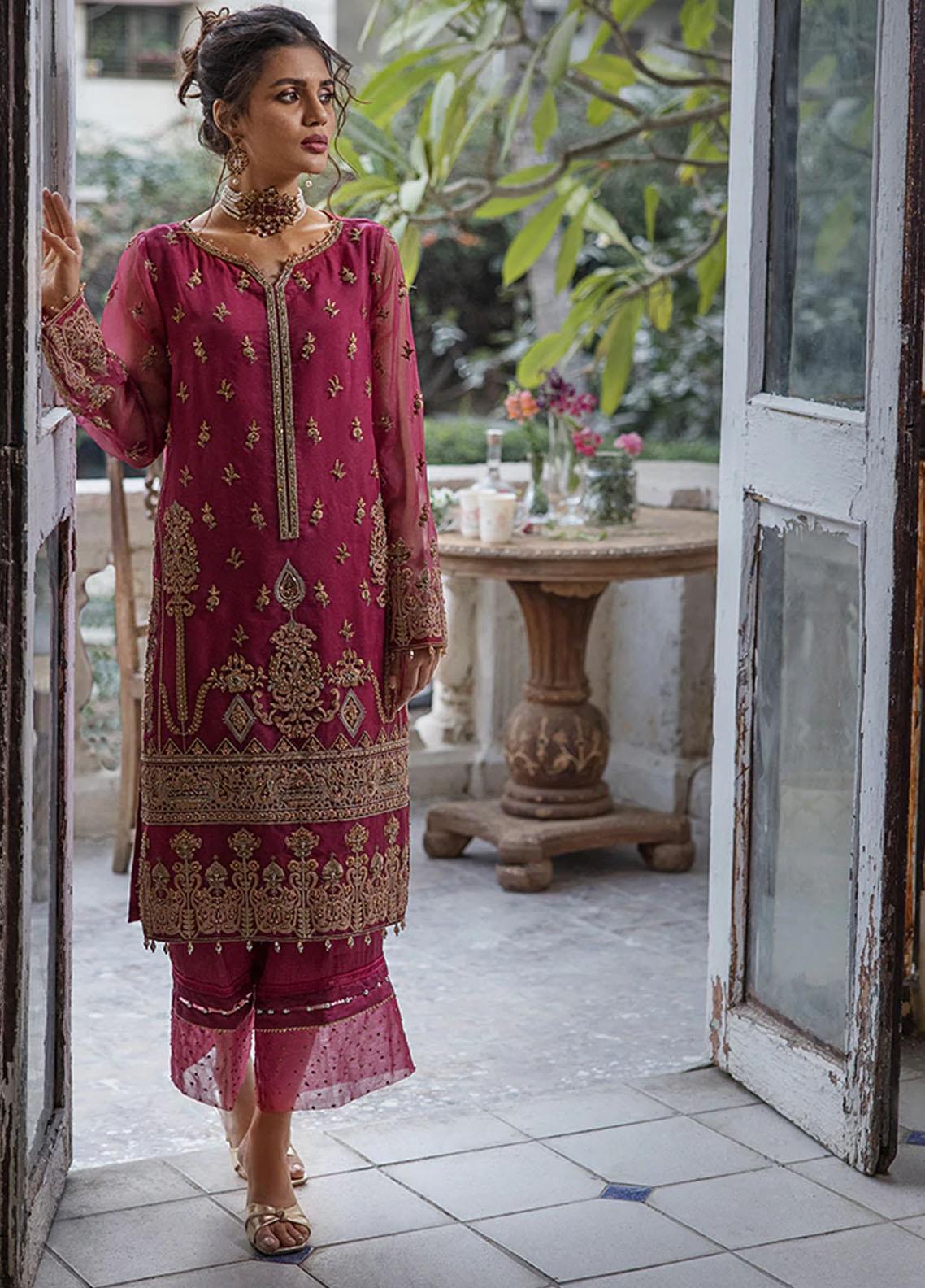 Fuchsia colored organza ready to wear tunic layered with stunning handwork details that includes kora, dabka, zaree and thread stitches. This ready to wear shirt will be easy on the eyes for this festive occasion.