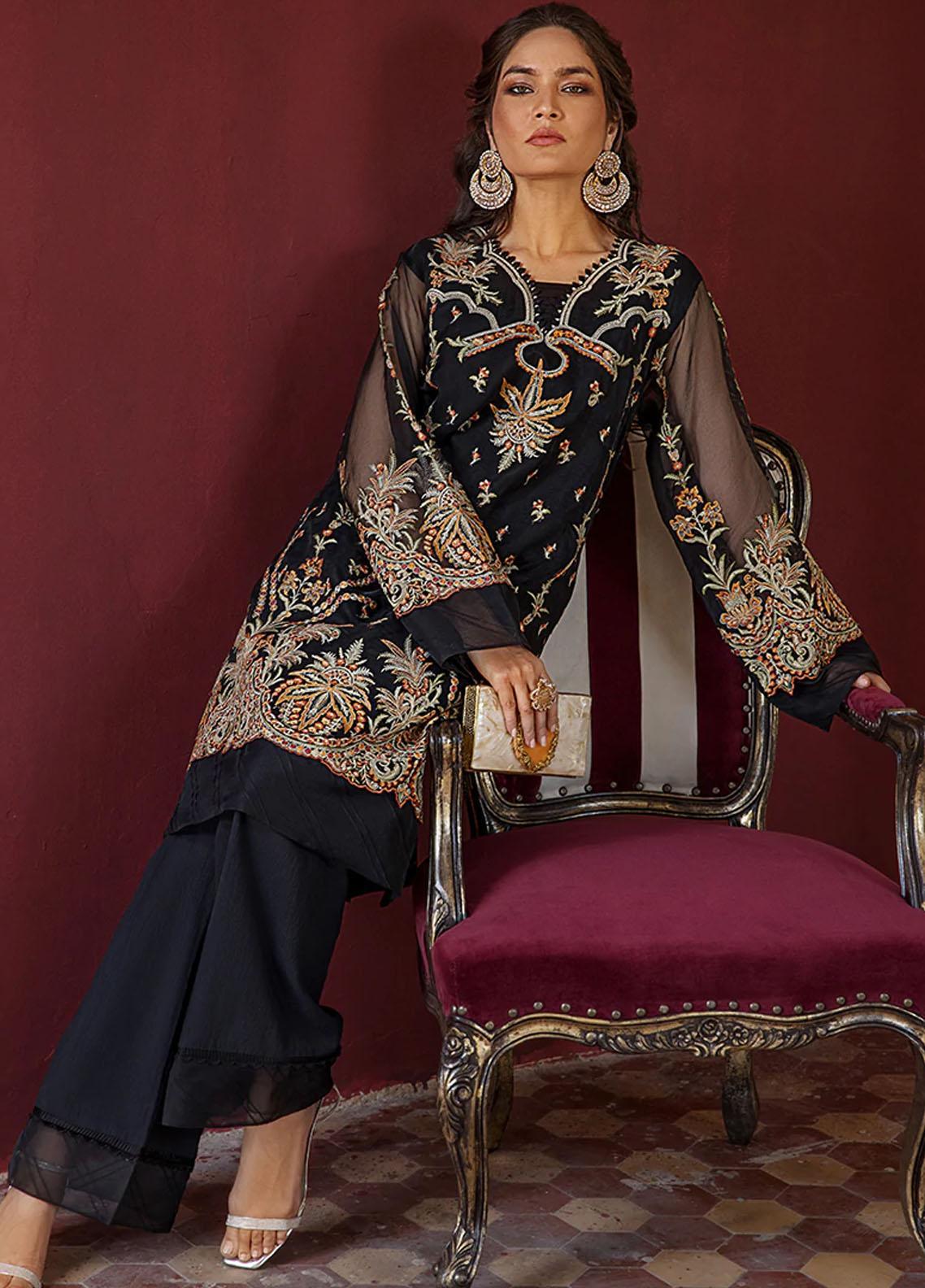 If youre someone who is constantly stressing with making mindful beauty choices for this Eid look. Heres beautiful black color organza tunic with playful embroideries in different colors. We have designed this tunic by professional fashion designers for exquisite look this summery Eid Day.