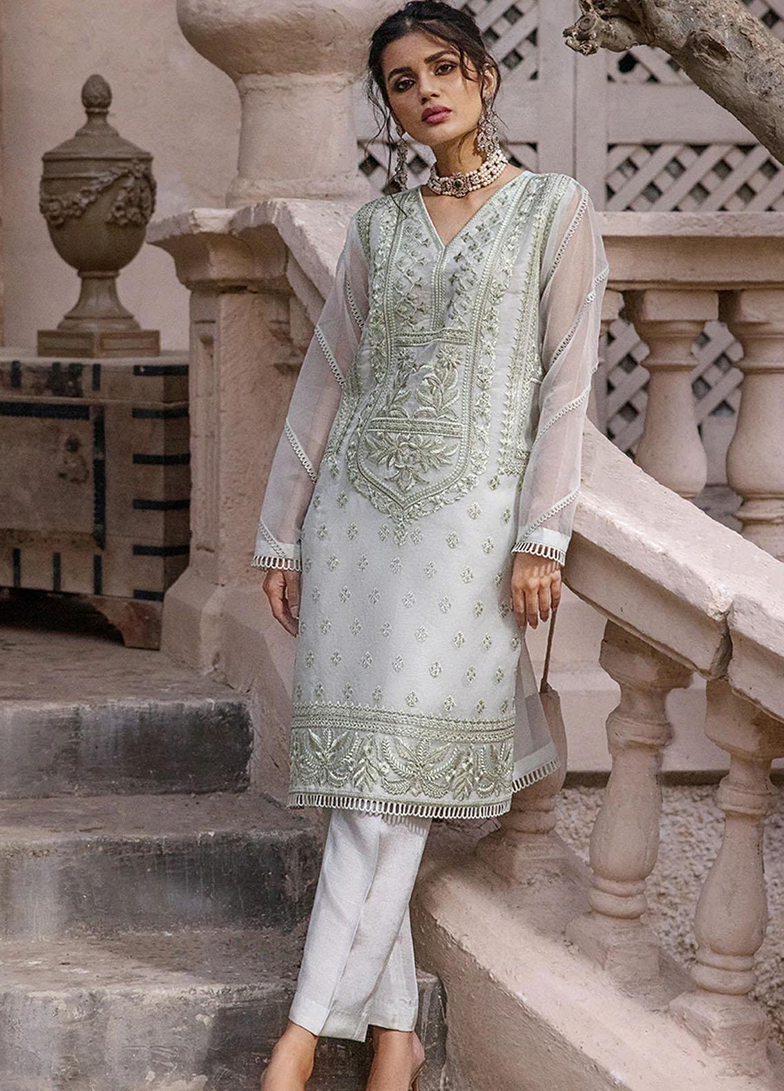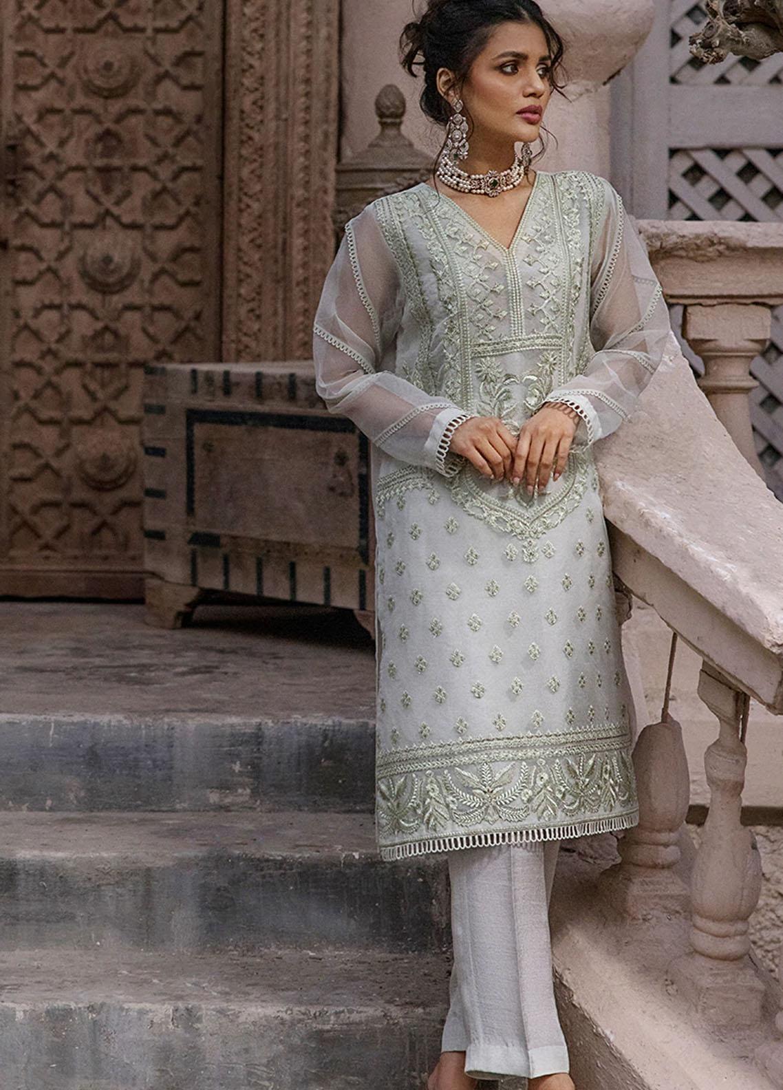 A new ready to wear design from our eid edit is attractive yet as pretty as picture. decorative embroidered border with boti style embroidery on sage green organza is a graceful option for this eid.