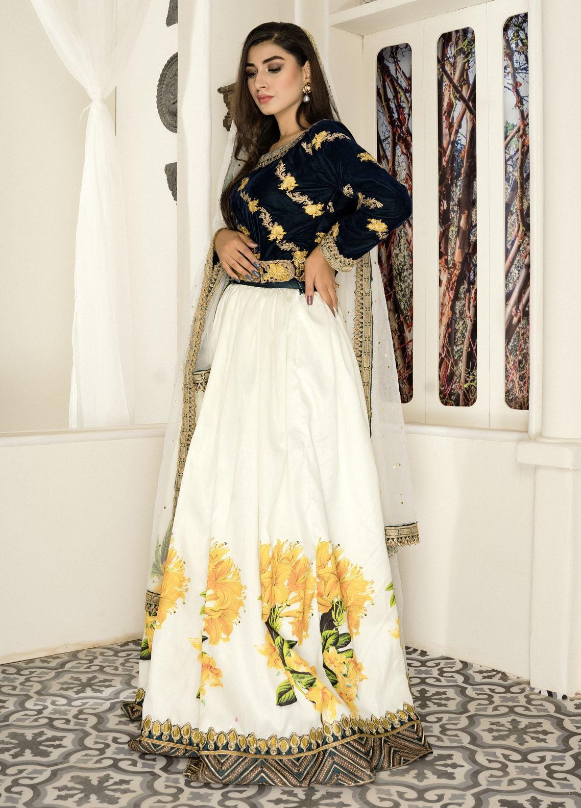 Featuring a mystical canopy of floral details, Solaris is a truly charming ensemble.Crafted from velvet choli, the modern styled short choli features exquisite embroidery and is paired with chic net mukash dupatta. Adorned with printed lehnga in majestic colours, one thing unique about this masterpiece is exquisite colour combinations. OH SO BEAUTIFUL