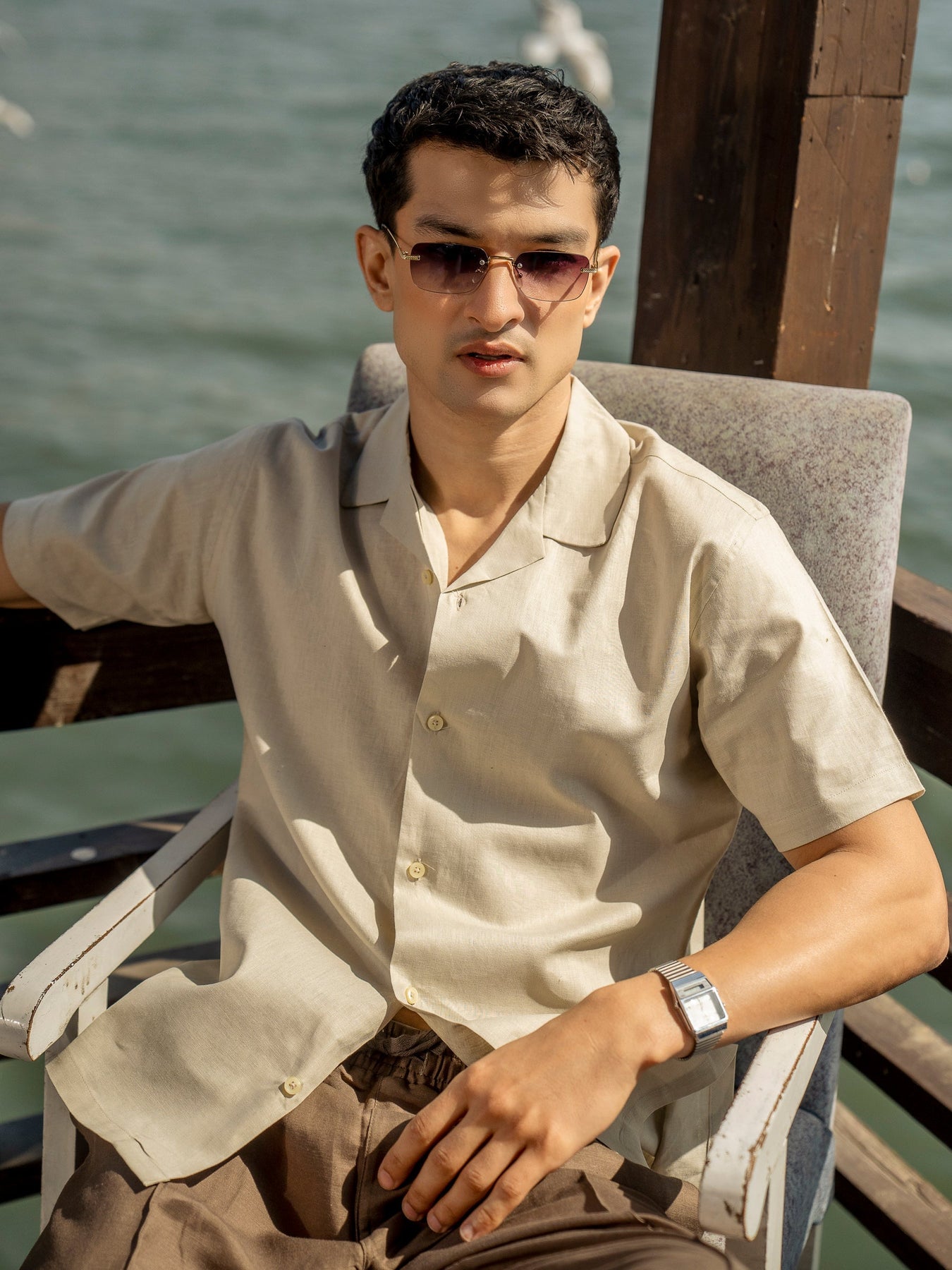 Opt for a cool look with our new beige linen blended cuban collar shirt. With its open notch lapel-like collar, it gives a relaxed and laid-back vibe, perfect for casual outings or beach gatherings. Linen makes this casual shirt airy and light weight