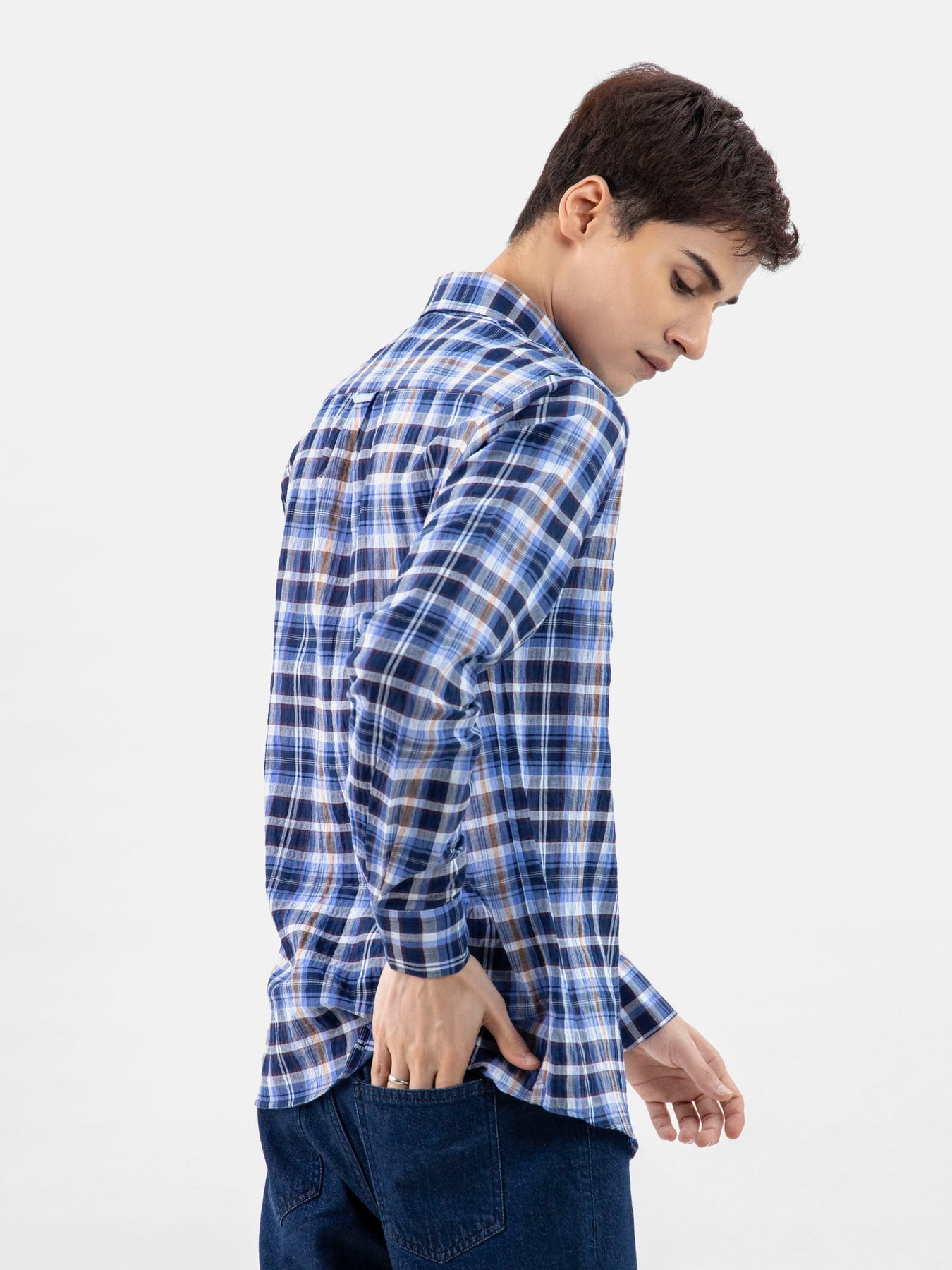 Opt for a casual look with our blue & black seersucked checkered shirt from SS'24. Featuring button down collar with detailing, this shirt is perfect for casual outings. An essential for staying stylish and cool during the warmer months. Seersucked fabric adds a touch of casualness to this shirt