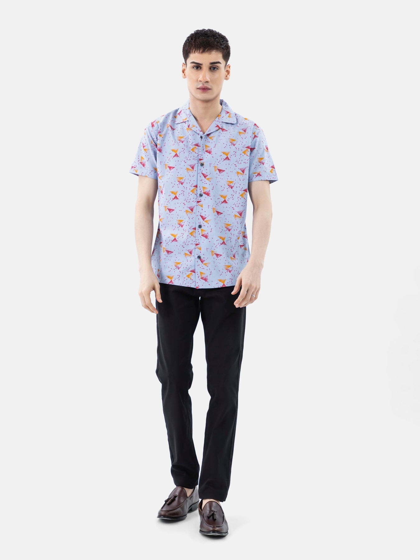 Opt for a contemporary look with our new blue & red abstract cuban collar shirt. With its open notch lapel-like collar, it gives a relaxed and laid-back vibe, perfect for casual outings or beach gatherings. Perfect for casual wear