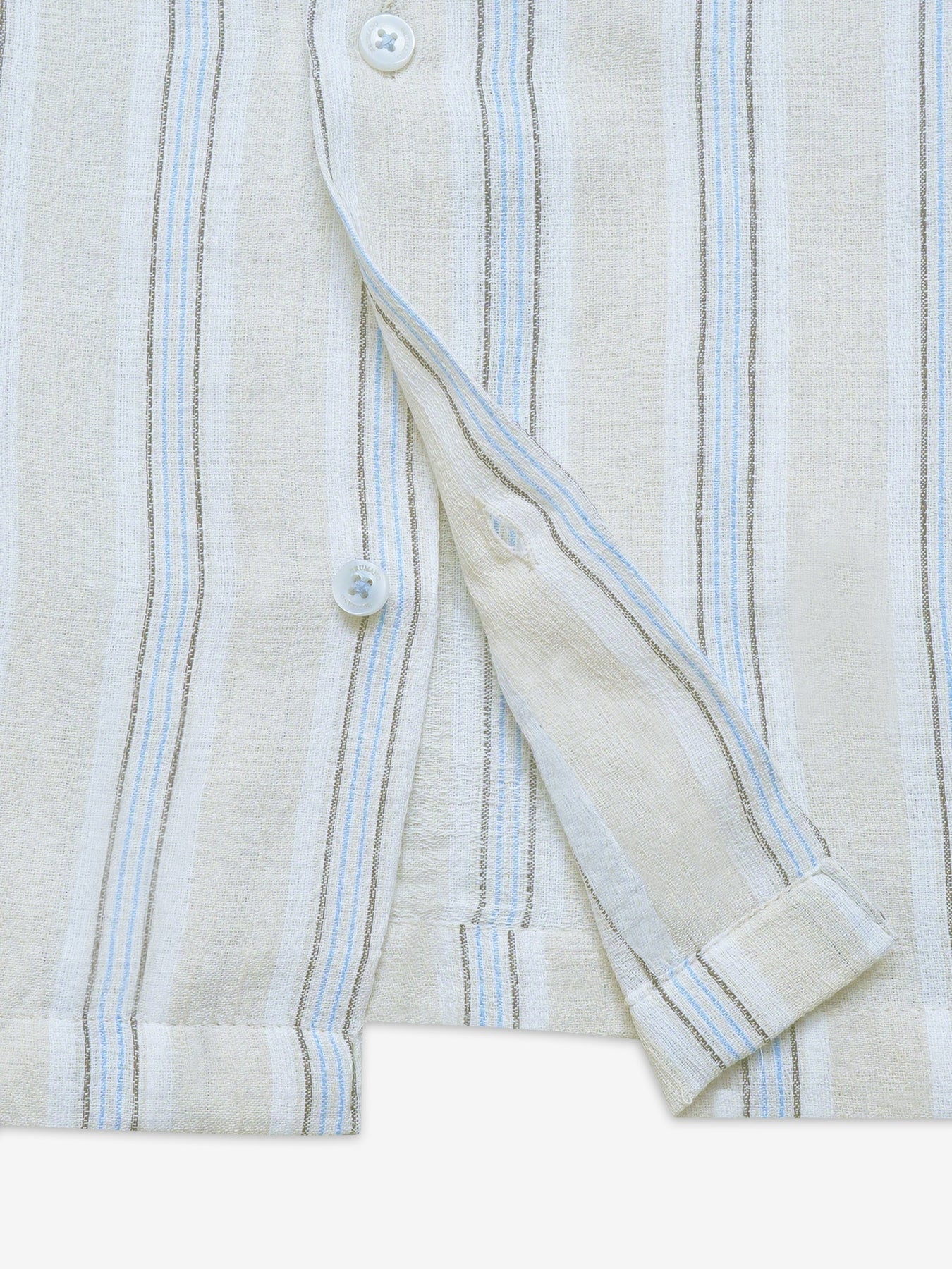 Keep it effortlessly stylish with this light beige striped & structured cuban collar shirt. Featuring clean stripes and a relaxed cuban collar, it’s made from structured fabric that feels soft yet polished. Perfect for casual hangouts or weekend getaways.