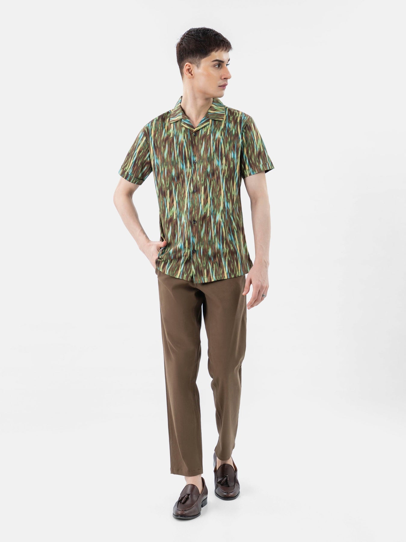 Opt for a contemporary look with our new olive green abstract cuban collar shirt. With its open notch lapel-like collar, it gives a relaxed and laid-back vibe, perfect for casual outings or beach gatherings. Perfect for casual wear