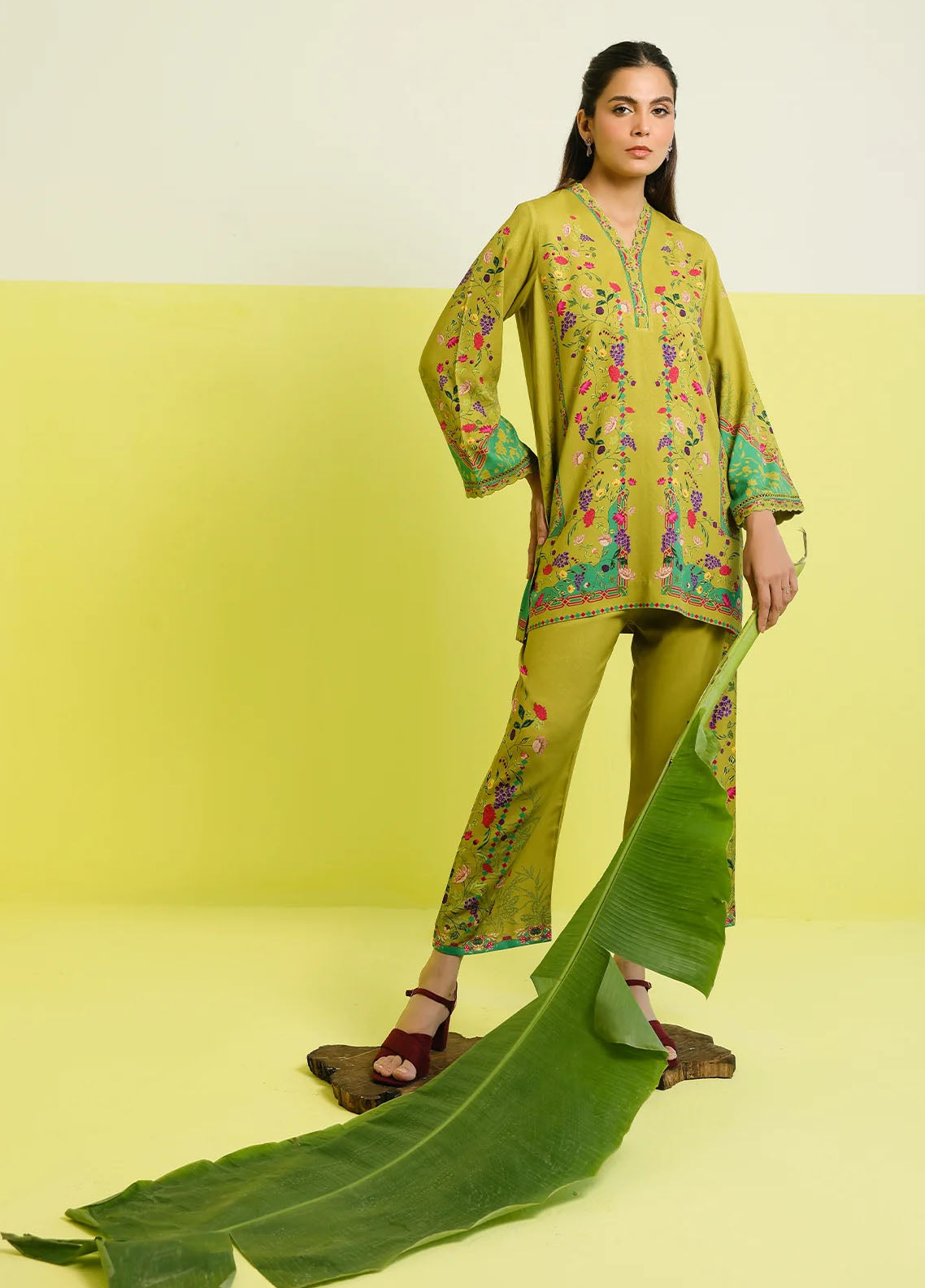 A refreshing two-piece set in olive green, beautifully adorned with vibrant floral prints in pink, purple, and fuchsia. The straight-fit shirt features a delicately detailed neckline, printed sleeves, and a patterned hemline, while the matching trousers are finished with coordinated floral motifs along the borders.