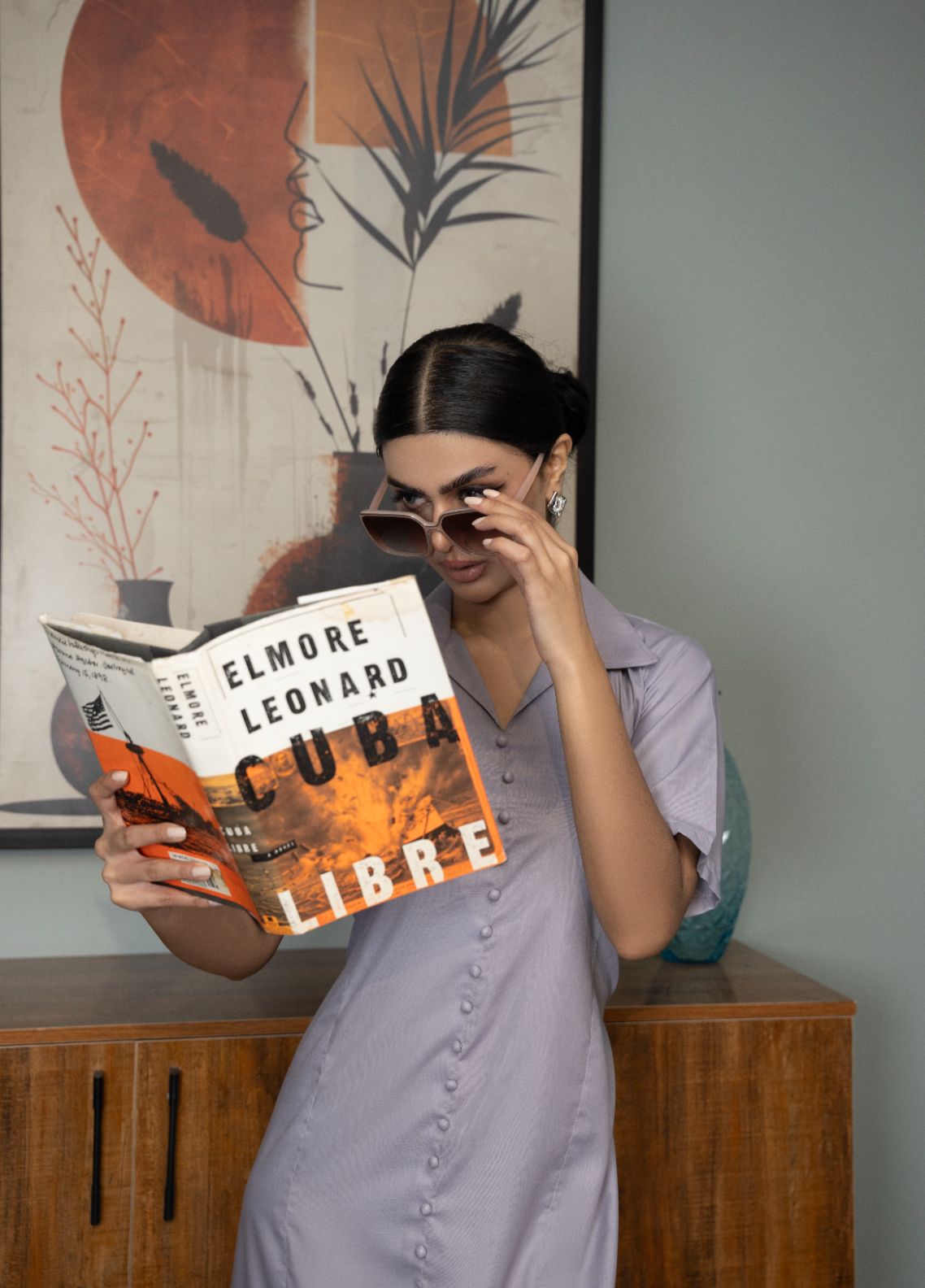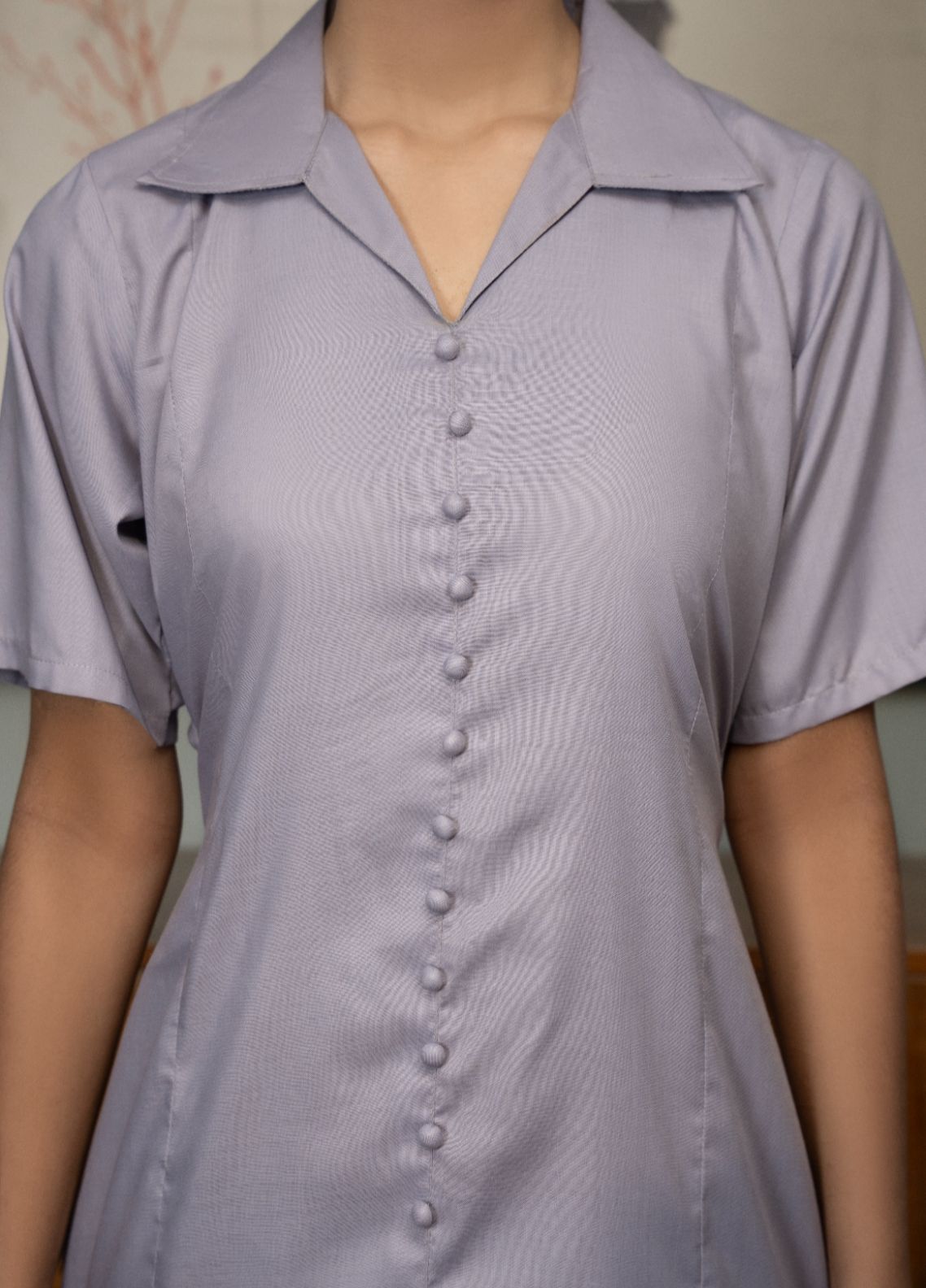 A long, dusky-toned dress with a coat-collar neckline and front-button design — timeless, versatile, and workwear-ready.