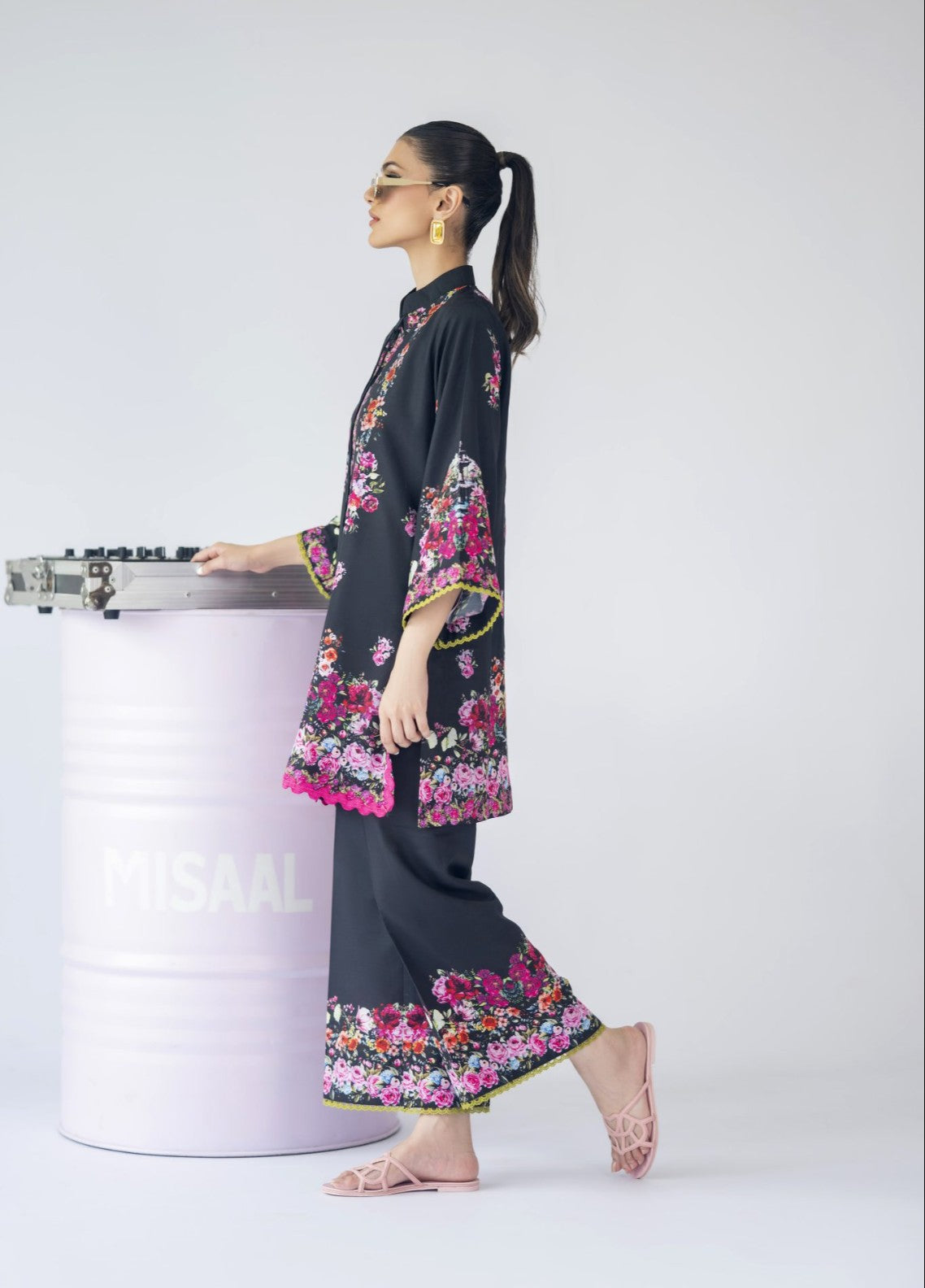 A printed floral shirt featuring a charming tie-knot neckline, paired with matching printed culottes for an effortlessly chic and coordinated look.