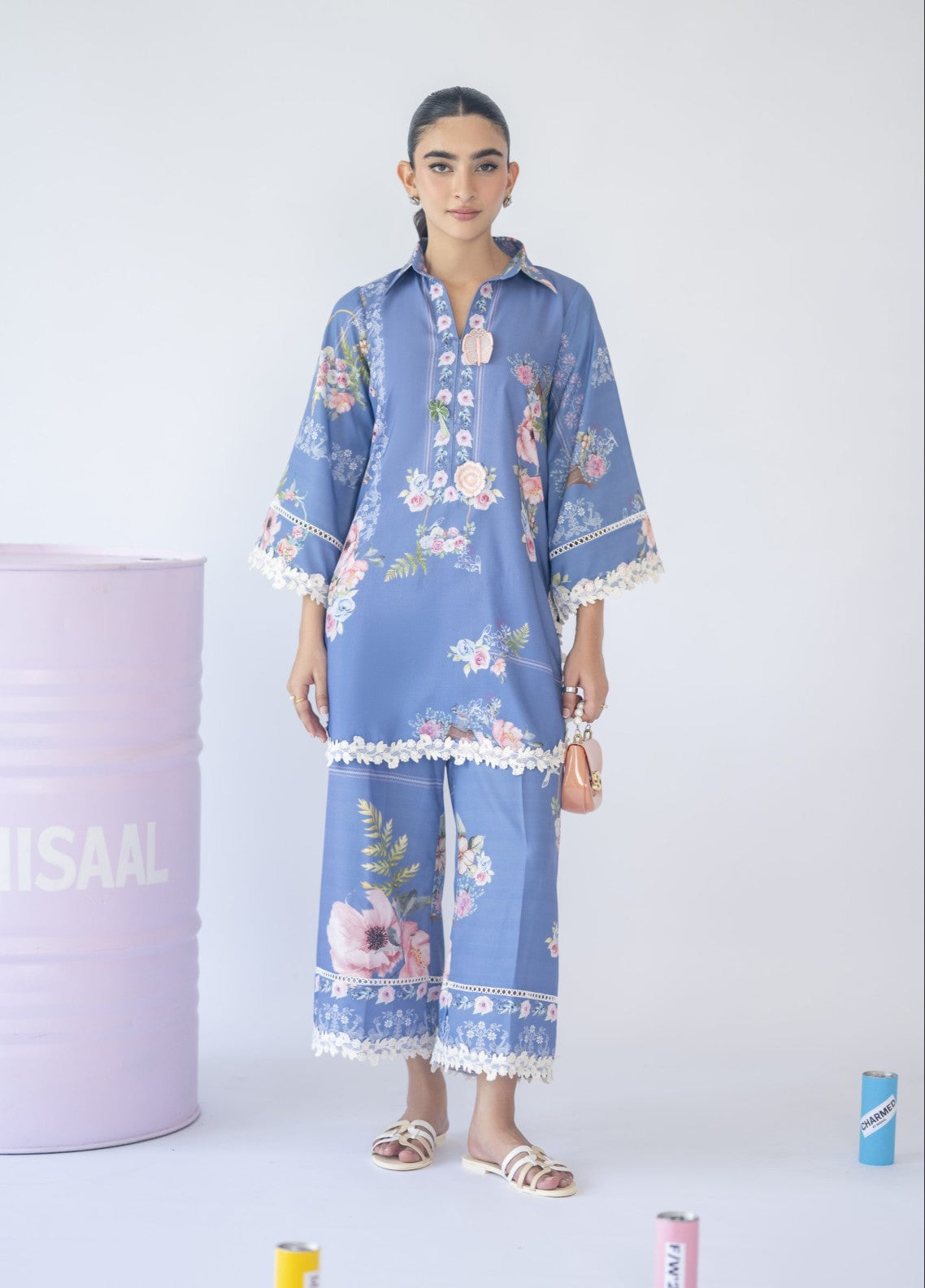 A floral print two-piece set featuring a 3D motif on the neckline and delicate white 3D lace inserts on the sleeves and culottes — feminine, fresh, and effortlessly chic.